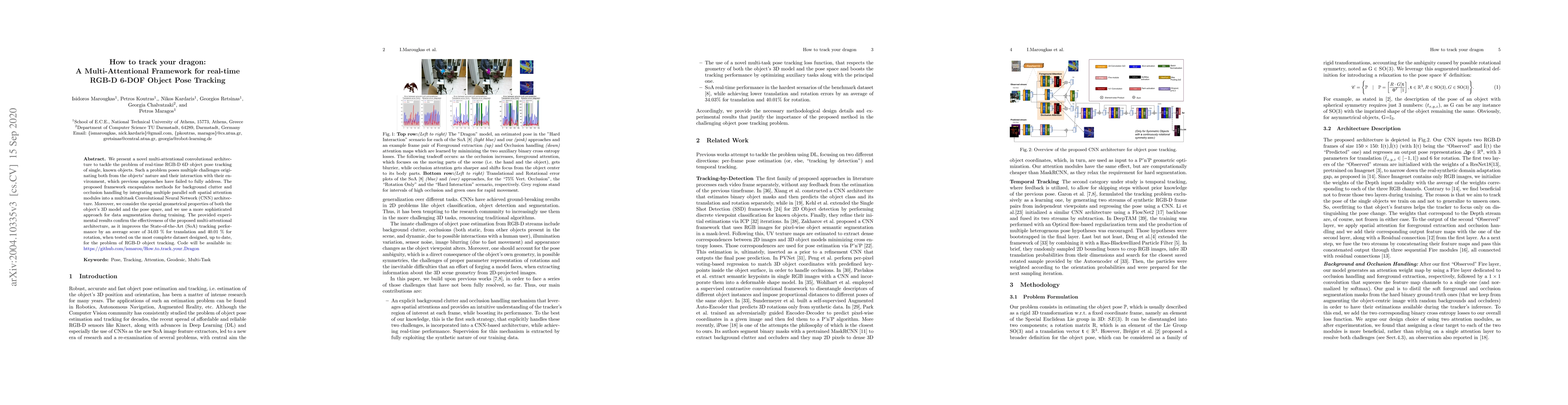 We present a novel multi-attentional convolutional architecture to tackle the problem of real-time RGB-D 6D object pose tracking of single, known objects. Such a problem poses multiple challenges originating both from the objects' nature and their interaction with their environment, which previous approaches have failed to fully address. The proposed framework encapsulates methods for background clutter and occlusion handling by integrating multiple parallel soft spatial attention modules into a multitask Convolutional Neural Network (CNN) architecture. Moreover, we consider the special geometrical properties of both the object's 3D model and the pose space, and we use a more sophisticated approach for data augmentation during training. The provided experimental results confirm the effectiveness of the proposed multi-attentional architecture, as it improves the State-of-the-Art (SoA) tracking performance by an average score of 34.03% for translation and 40.01% for rotation, when tested on the most complete dataset designed, up to date,for the problem of RGB-D object tracking.