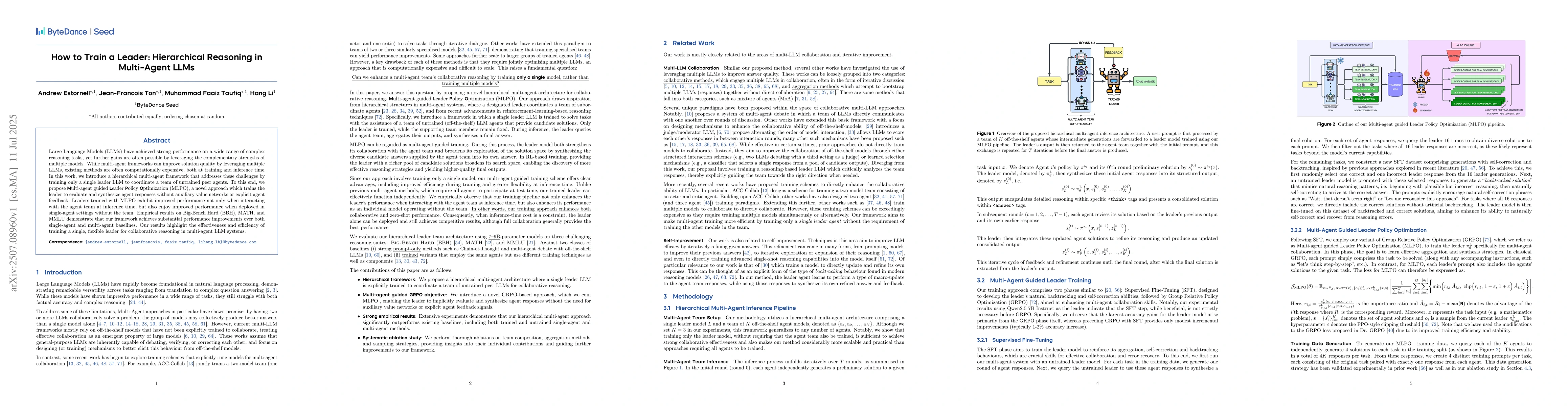 The research introduces a hierarchical multi-agent framework using Multi-Agent Guided Leader Policy Optimization (MLPO) to train a single leader LLM to coordinate a team of untrained peer agents, improving performance in both multi-agent and single-agent settings.