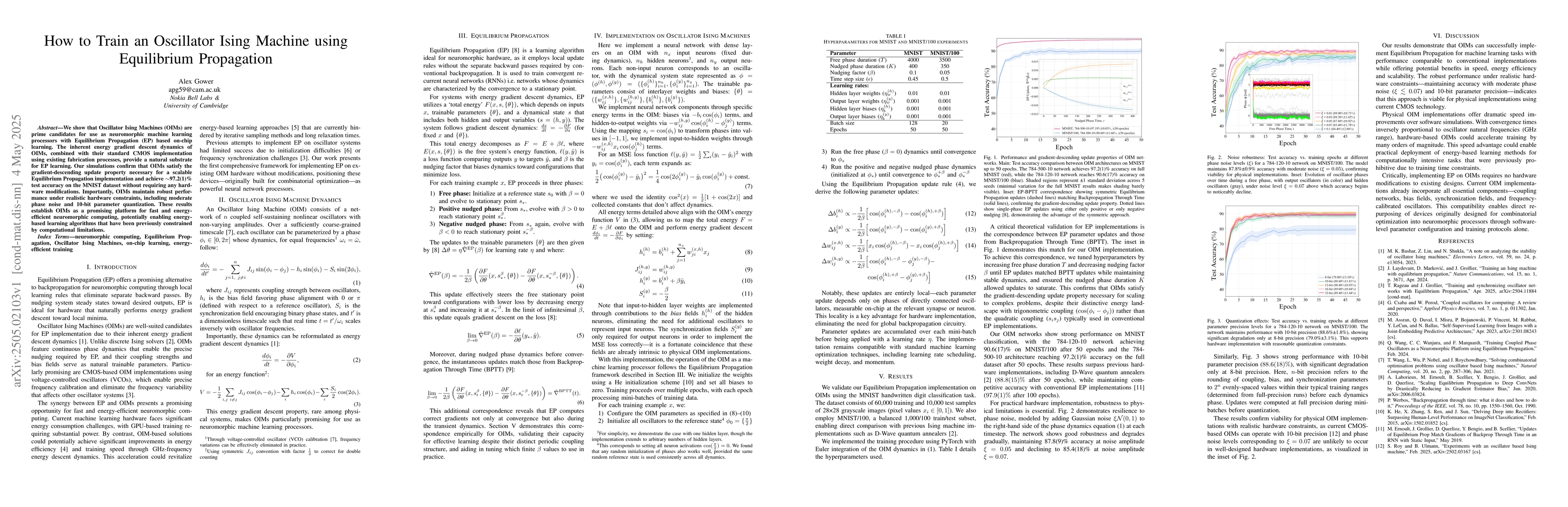The work combines OIMs with EP learning, demonstrating their suitability for neuromorphic computing and offering a novel approach to on-chip learning with continuous phase dynamics and precise frequency calibration.