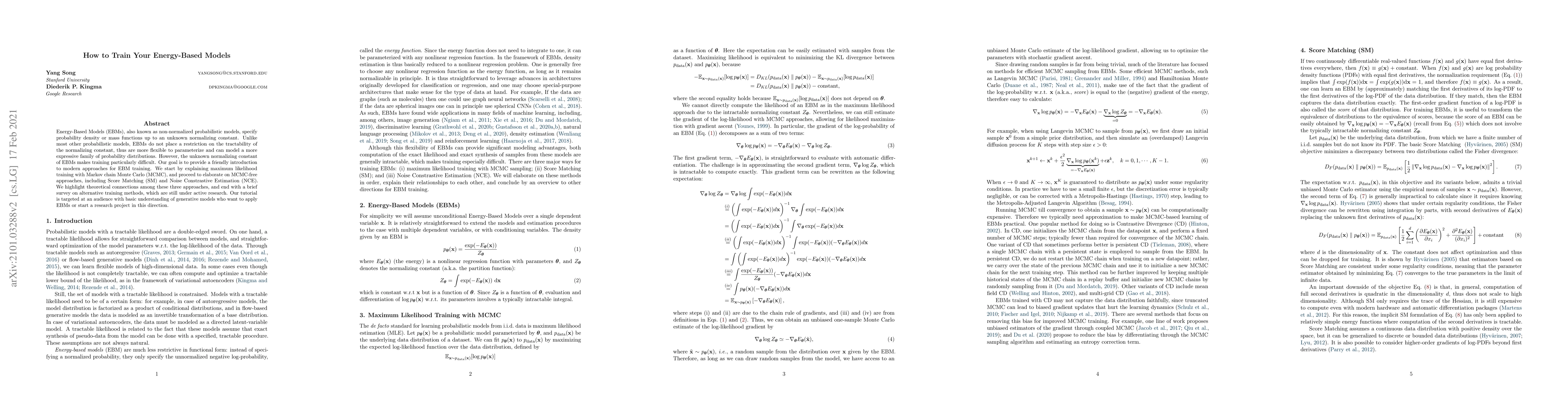 This paper introduces modern approaches for training Energy-Based Models (EBMs), including maximum likelihood training with Markov chain Monte Carlo, Score Matching, and Noise Contrastive Estimation, to help researchers apply EBMs or start a research project in this direction.