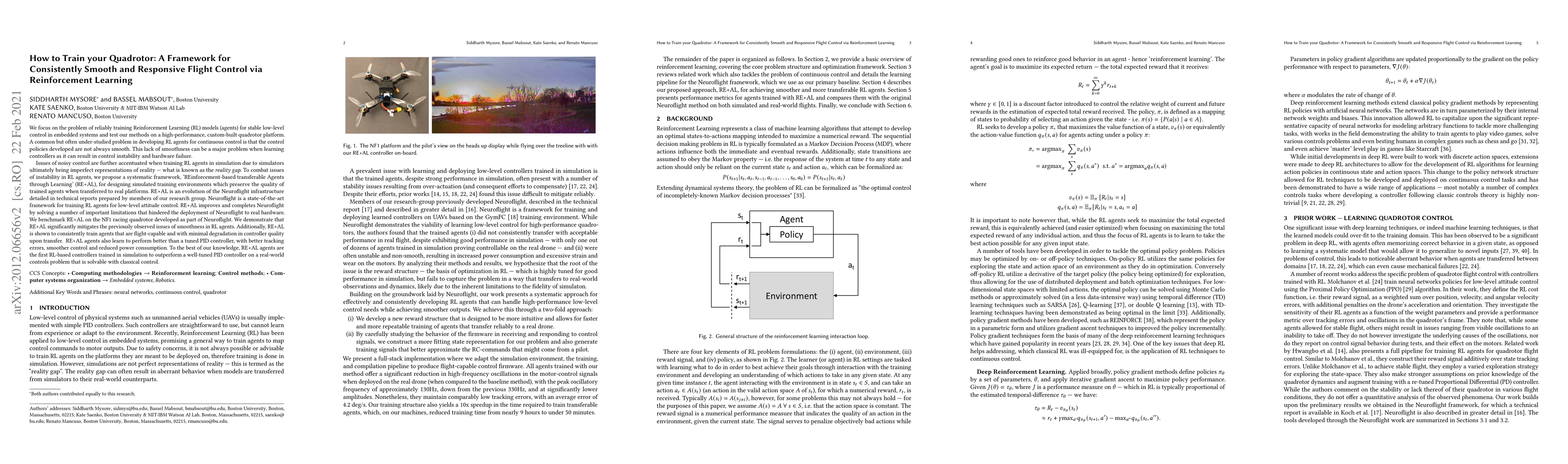 This paper proposes a framework called RE+AL for training Reinforcement Learning agents to achieve smooth and responsive control for quadrotor drones, addressing issues of instability and the reality gap. RE+AL improves upon the Neuroflight framework, demonstrating better transferability and performance compared to traditional PID controllers.