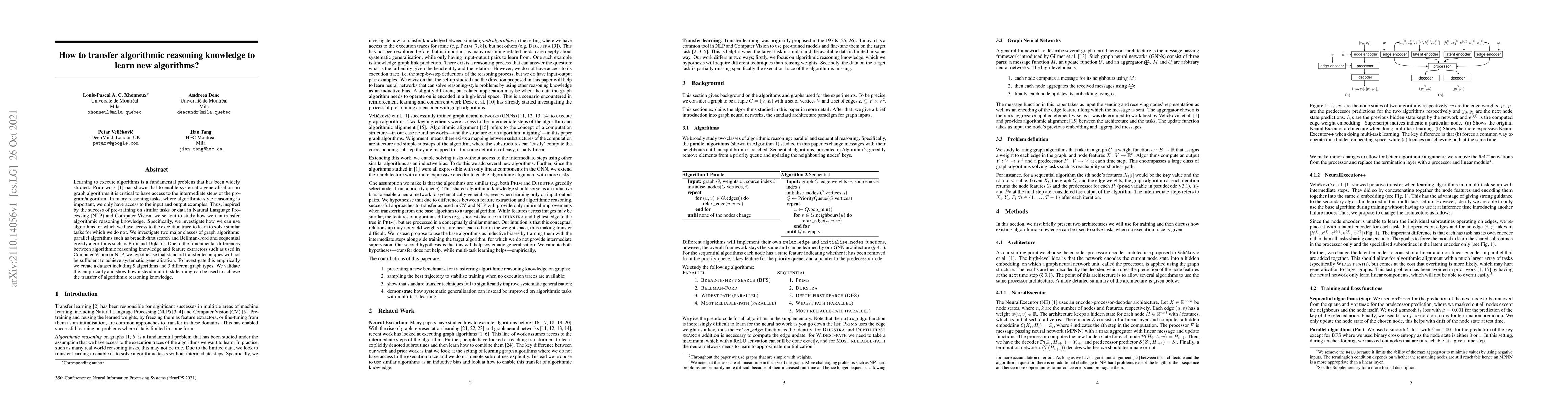Learning to execute algorithms is a fundamental problem that has been widely studied. Prior work~\cite{veli19neural} has shown that to enable systematic generalisation on graph algorithms it is critical to have access to the intermediate steps of the program/algorithm. In many reasoning tasks, where algorithmic-style reasoning is important, we only have access to the input and output examples. Thus, inspired by the success of pre-training on similar tasks or data in Natural Language Processing (NLP) and Computer Vision, we set out to study how we can transfer algorithmic reasoning knowledge. Specifically, we investigate how we can use algorithms for which we have access to the execution trace to learn to solve similar tasks for which we do not. We investigate two major classes of graph algorithms, parallel algorithms such as breadth-first search and Bellman-Ford and sequential greedy algorithms such as Prim and Dijkstra. Due to the fundamental differences between algorithmic reasoning knowledge and feature extractors such as used in Computer Vision or NLP, we hypothesise that standard transfer techniques will not be sufficient to achieve systematic generalisation. To investigate this empirically we create a dataset including 9 algorithms and 3 different graph types. We validate this empirically and show how instead multi-task learning can be used to achieve the transfer of algorithmic reasoning knowledge.