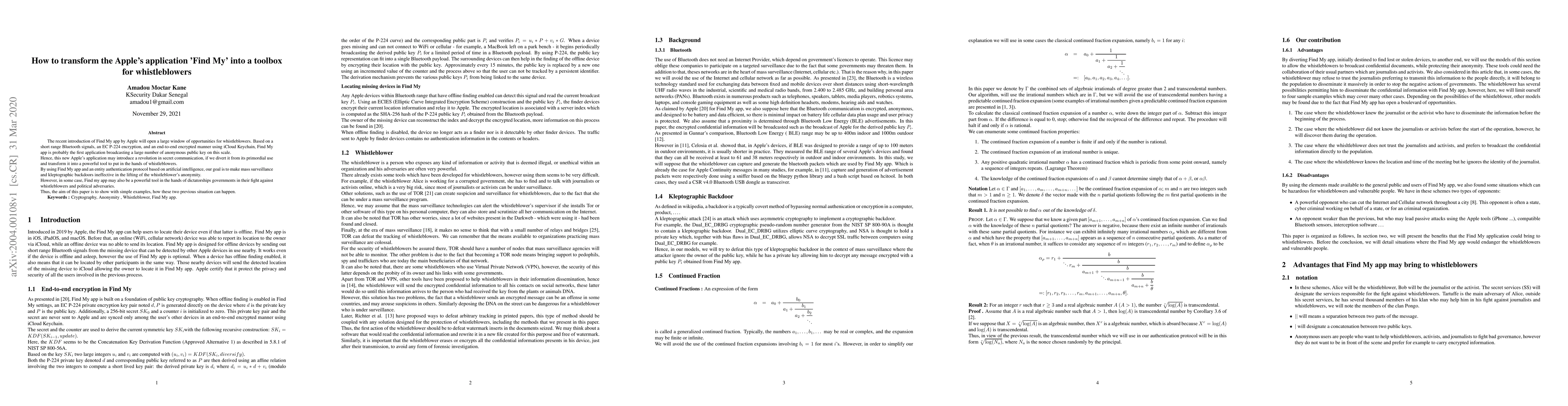 The paper proposes transforming Apple's Find My app into a toolbox for whistleblowers by using an entity authentication protocol based on artificial intelligence, aiming to make mass surveillance and kleptographic backdoors ineffective in preserving whistleblower anonymity.