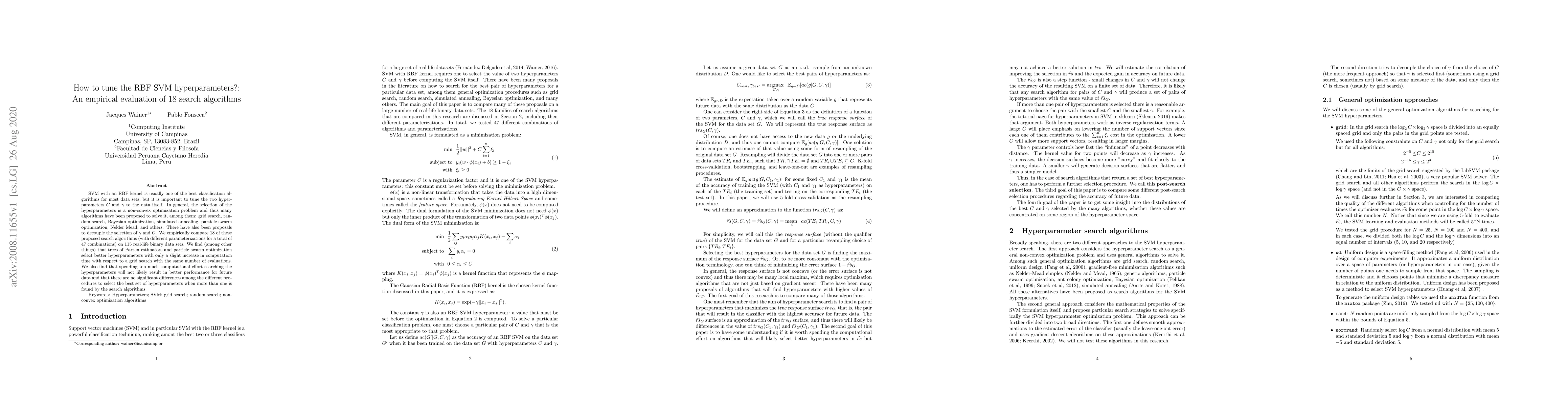 Researchers compared 18 search algorithms for tuning RBF SVM hyperparameters on 115 datasets and found that some methods, like tree-based and particle swarm optimization, select better hyperparameters with minimal increased computation time.