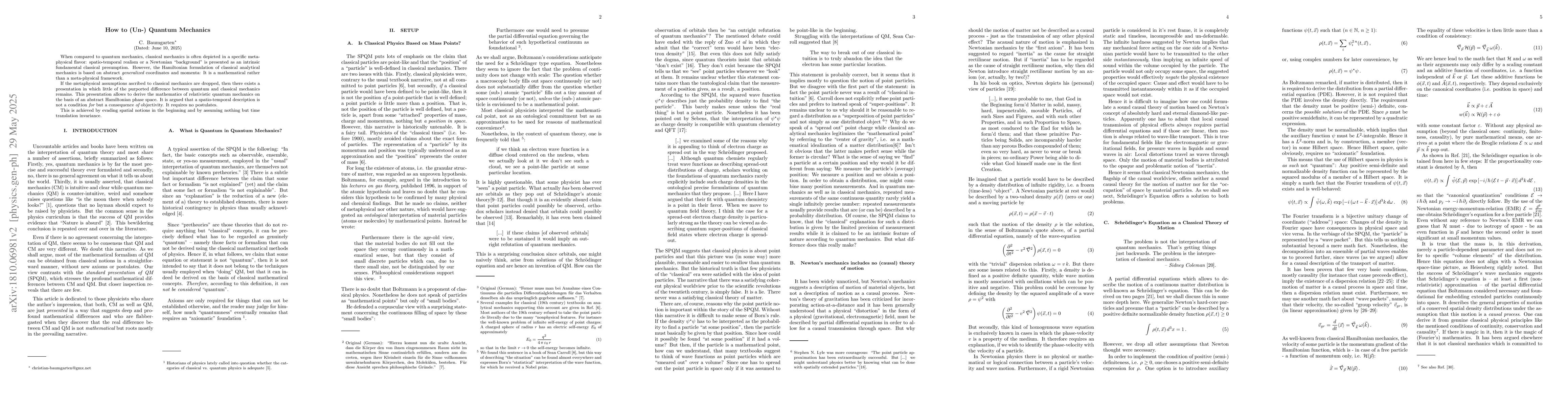 When compared to quantum mechanics, classical mechanics is often depicted in a specific metaphysical flavour: spatio-temporal realism or a Newtonian "background" is presented as an intrinsic fundamental classical presumption. However, the Hamiltonian formulation of classical analytical mechanics is based on abstract generalized coordinates and momenta: It is a mathematical rather than a philosophical framework. If the metaphysical assumptions ascribed to classical mechanics are dropped, then there exists a presentation in which little of the purported difference between quantum and classical mechanics remains. This presentation allows to derive the mathematics of relativistic quantum mechanics on the basis of a purely classical Hamiltonian phase space picture. It is shown that a spatio-temporal description is not a condition for but a consequence of objectivity. It requires no postulates. This is achieved by evading spatial notions and assuming nothing but time translation invariance.