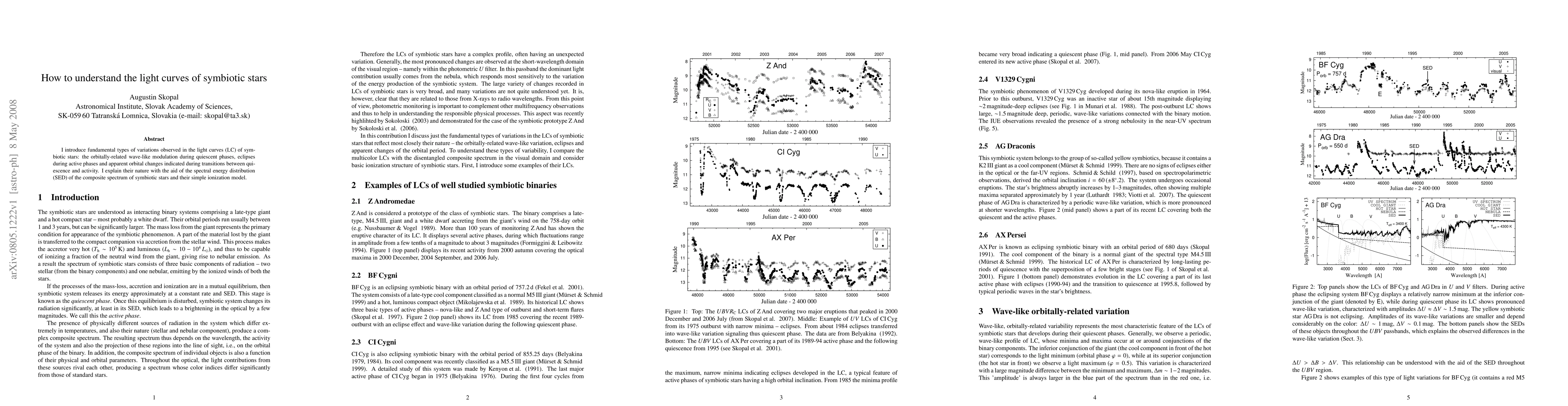 I introduce fundamental types of variations observed in the light curves (LC) of symbiotic stars: the orbitally-related wave-like modulation during quiescent phases, eclipses during active phases and apparent orbital changes indicated during transitions between quiescence and activity. I explain their nature with the aid of the spectral energy distribution (SED) of the composite spectrum of symbiotic stars and their simple ionization model.