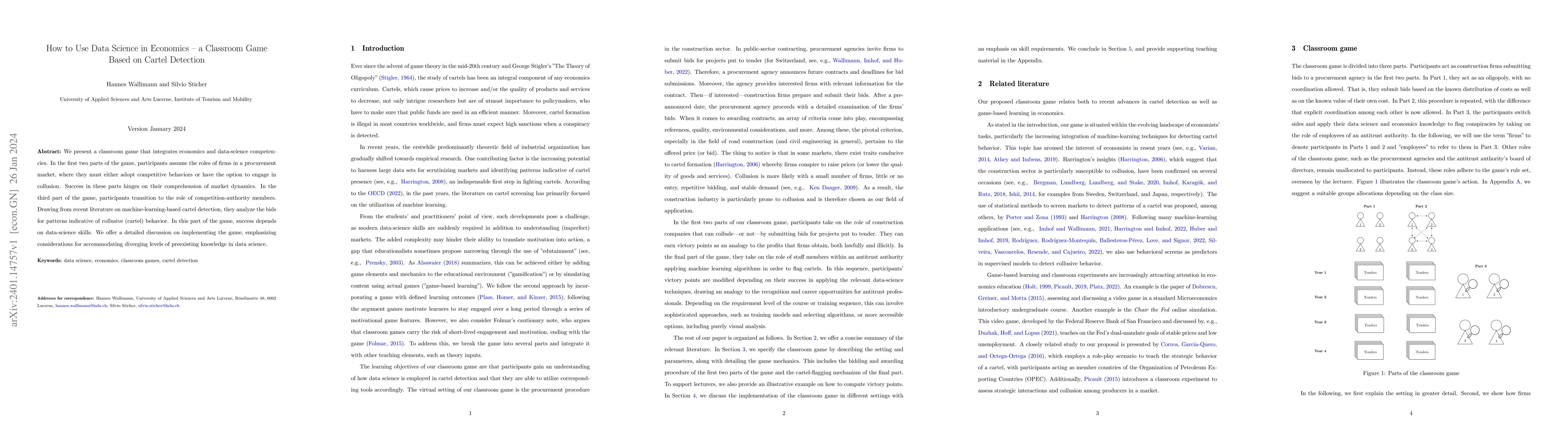 This paper introduces a classroom game that combines economics and data science to teach cartel detection. The game involves firms competing or colluding in a procurement market, followed by a role-play as competition-authority members analyzing bid data for collusive patterns using machine learning. The game's implementation accommodates varying levels of prior data science knowledge.