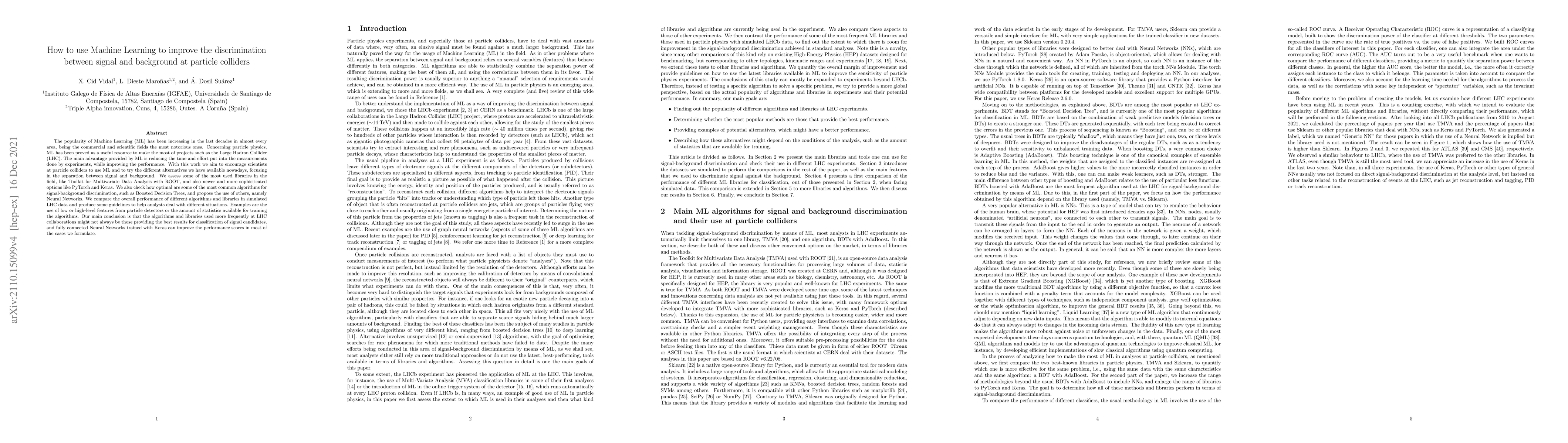 This paper explores the application of Machine Learning techniques to enhance the discrimination between signal and background in particle collider experiments, specifically at the Large Hadron Collider. It evaluates various ML libraries and algorithms, including Boosted Decision Trees and Neural Networks, and provides guidelines for their optimal use based on simulated data.