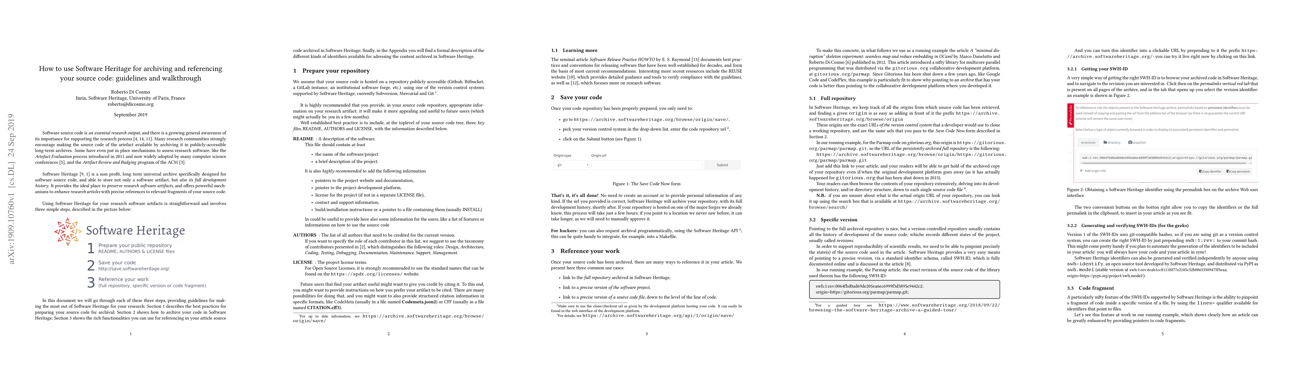 This paper outlines the process of using Software Heritage to archive and reference source code, emphasizing its role as a long-term universal archive for software development history. It provides a three-step walkthrough to help researchers preserve their software artifacts and enhance their articles with precise code references.