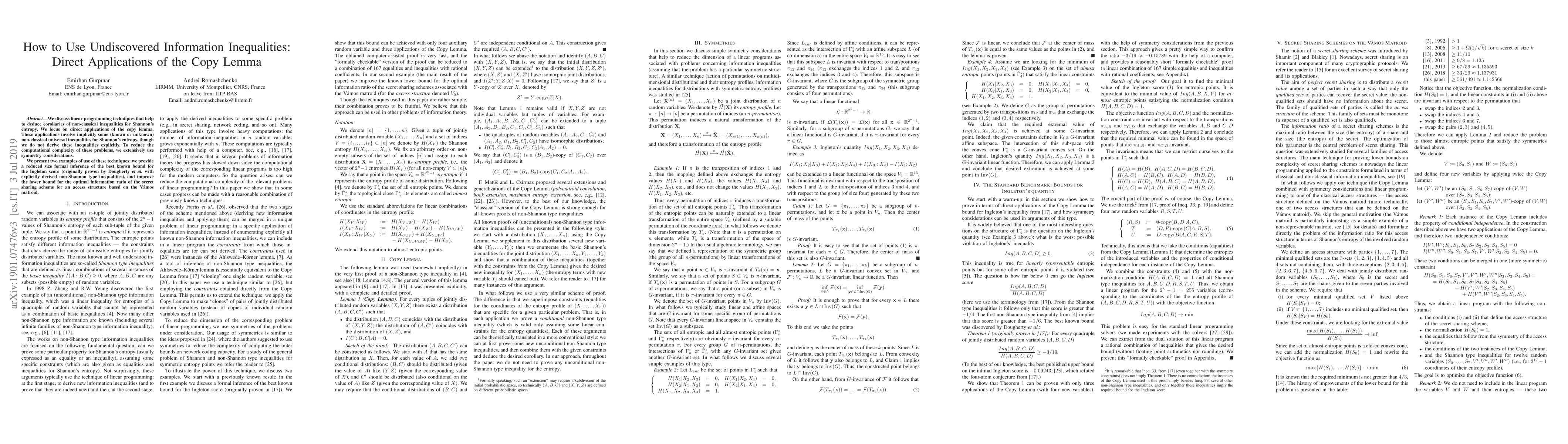 We discuss linear programming techniques that help to deduce corollaries of non classic inequalities for Shannon's entropy. We focus on direct applications of the copy lemma. These applications involve implicitly some (known or unknown) non-classic universal inequalities for Shannon's entropy, though we do not derive these inequalities explicitly. To reduce the computational complexity of these problems, we extensively use symmetry considerations. We present two examples of usage of these techniques: we provide a reduced size formal inference of the best known bound for the Ingleton score (originally proven by Dougherty \emph{et al.} with explicitly derived non Shannon type inequalities), and improve the lower bound for the optimal information ratio of the secret sharing scheme for an access structure based on the Vamos matroid.