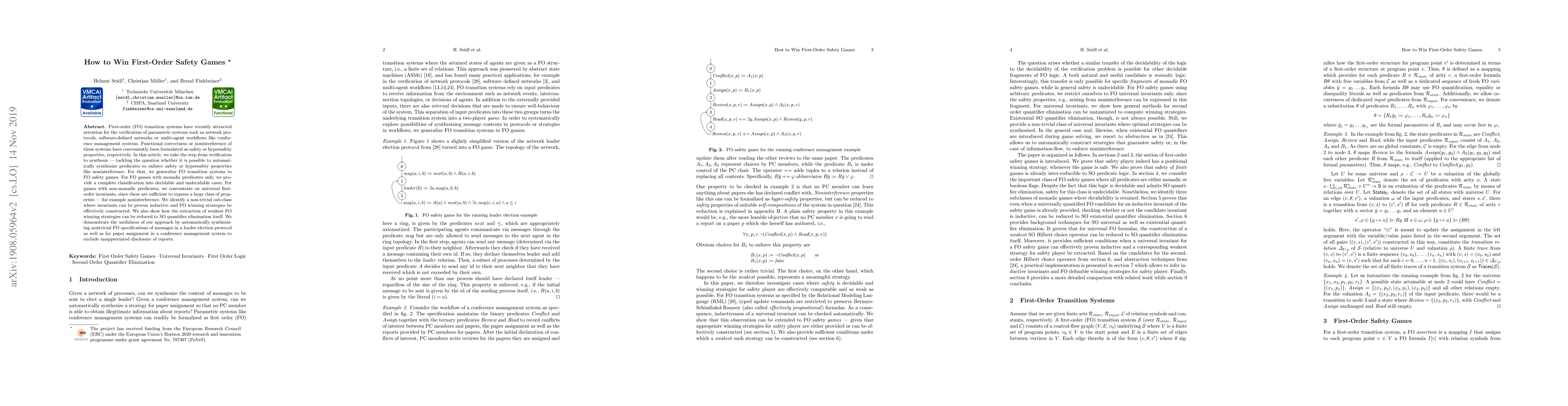 First-order (FO) transition systems have recently attracted attention for the verification of parametric systems such as network protocols, software-defined networks or multi-agent workflows like conference management systems. Desirable properties of these systems such as functional correctness or noninterference have conveniently been formulated as safety properties. In order to automatically synthesize strategies that enforce safety or noninterference, we generalize FO transition systems to FO safety games. We prove that the existence of a winning strategy of safety player in finite games is in fact, equivalent to second-order quantifier elimination. For the important case of FO games with monadic predicates only, we provide a complete classification into decidable and undecidable cases. For games with non-monadic predicates, we concentrate on universal first-order invariants, since these are sufficient to express a large class of noninterference properties. Based on general techniques for second-order quantifier elimination, we provide abstraction and refinement techniques in order to synthesize FO strategies that enforce safety. We demonstrate the usefulness of our approach by inferring nontrivial FO specifications in a leader election protocol as well as for paper assignment in a conference mangagement system to exclude unappreciated disclosure of reports.