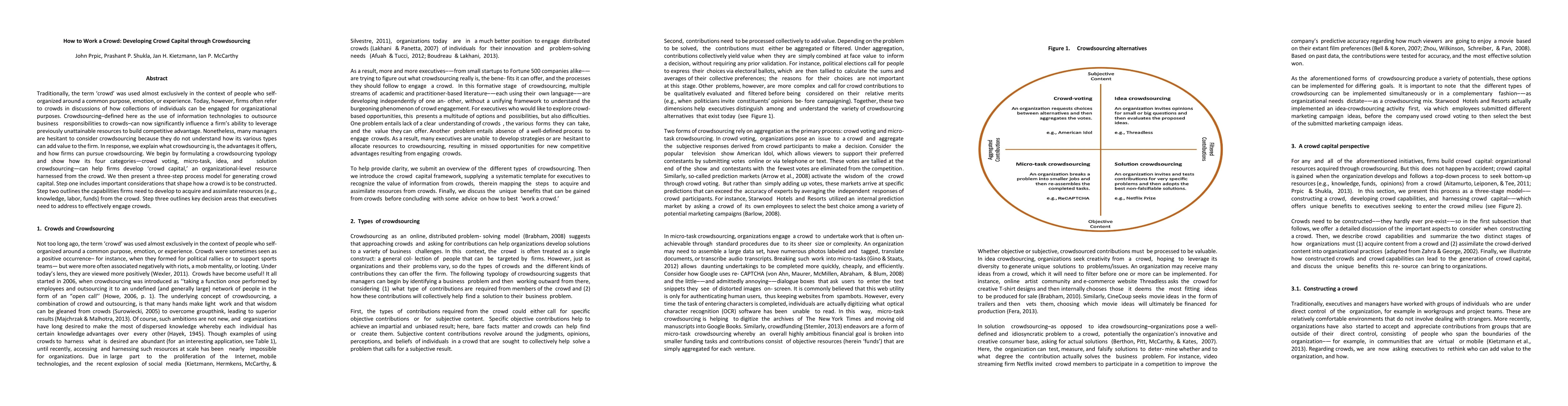 This paper explores crowdsourcing as a method for firms to harness collective resources from crowds to build competitive advantage. It introduces a typology of crowdsourcing types and outlines a three-step process model for developing "crowd capital," emphasizing considerations for crowd construction, required capabilities for resource acquisition, and key decision areas for effective engagement.
