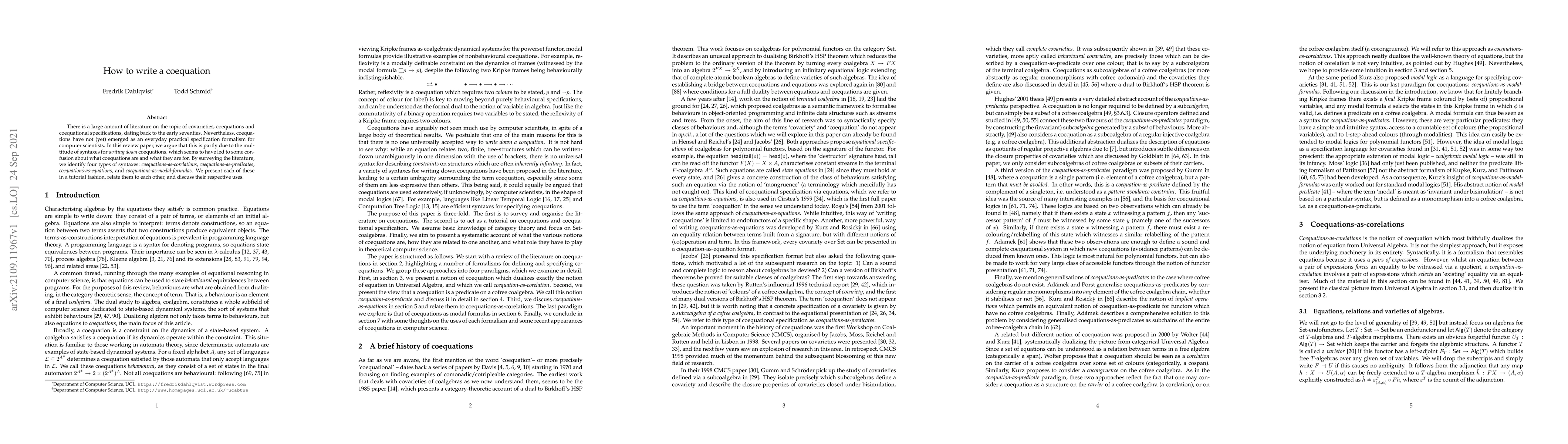 There is a large amount of literature on the topic of covarieties, coequations and coequational specifications, dating back to the early seventies. Nevertheless, coequations have not (yet) emerged as an everyday practical specification formalism for computer scientists. In this review paper, we argue that this is partly due to the multitude of syntaxes for writing down coequations, which seems to have led to some confusion about what coequations are and what they are for. By surveying the literature, we identify four types of syntaxes: coequations-as-corelations, coequations-as-predicates, coequations-as-equations, and coequations-as-modal-formulas. We present each of these in a tutorial fashion, relate them to each other, and discuss their respective uses.