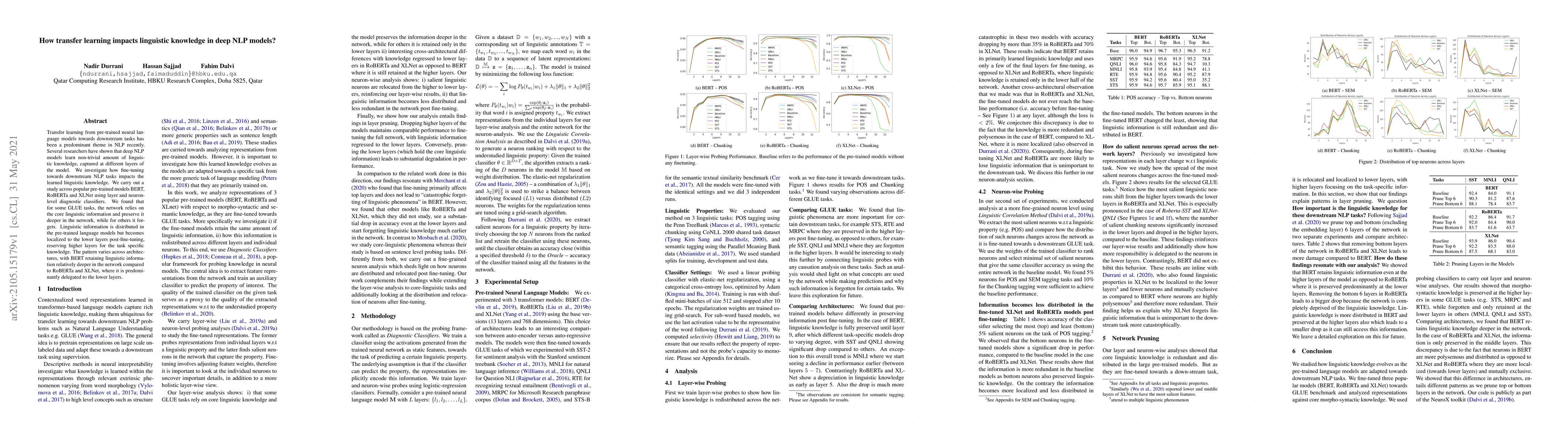 This study examines how transfer learning affects linguistic knowledge in deep NLP models, finding that while some pre-trained models like BERT retain linguistic information deeper, others like RoBERTa and XLNet localize it to lower layers post-fine-tuning, indicating varying impacts on linguistic knowledge across different architectures.