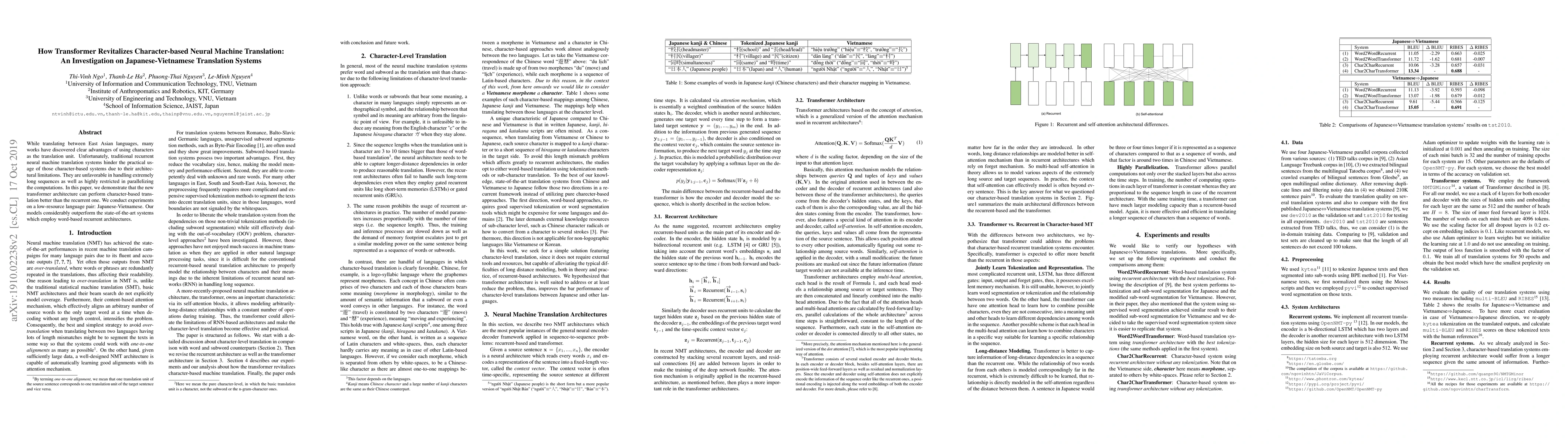 This paper investigates how the transformer architecture revitalizes character-based neural machine translation, demonstrating its superiority over traditional recurrent systems through experiments on Japanese-Vietnamese translation, showing significant improvements over word-based recurrent models.