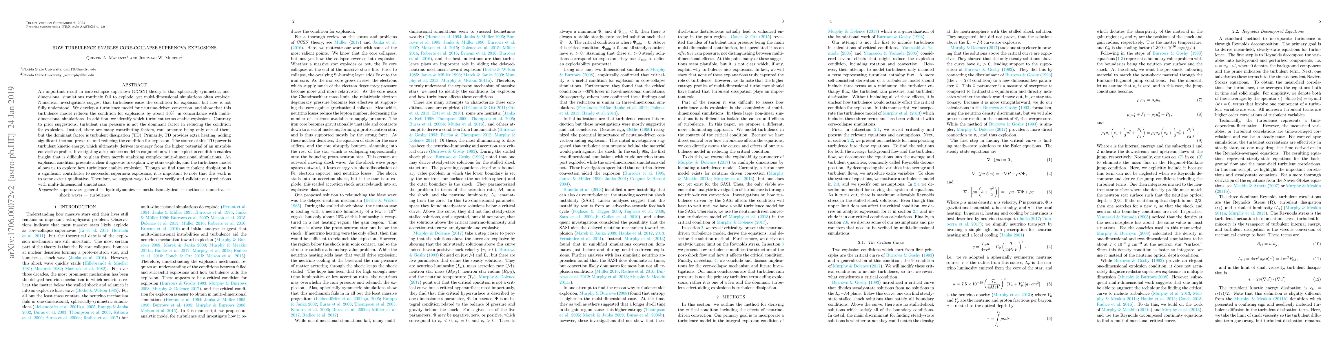 An important result in core-collapse supernova (CCSN) theory is that spherically-symmetric, one-dimensional simulations routinely fail to explode, yet multi-dimensional simulations often explode. Numerical investigations suggest that turbulence eases the condition for explosion, but how is not fully understood. We develop a turbulence model for neutrino-driven convection, and show that this turbulence model reduces the condition for explosions by about 30%, in concordance with multi-dimensional simulations. In addition, we identify which turbulent terms enable explosions. Contrary to prior suggestions, turbulent ram pressure is not the dominant factor in reducing the condition for explosion. Instead, there are many contributing factors, ram pressure being only one of them, but the dominant factor is turbulent dissipation (TD). Primarily, TD provides extra heating, adding significant thermal pressure, and reducing the condition for explosion. The source of this TD power is turbulent kinetic energy, which ultimately derives its energy from the higher potential of an unstable convective profile. Investigating a turbulence model in conjunction with an explosion condition enables insight that is difficult to glean from merely analyzing complex multi-dimensional simulations. An explosion condition presents a clear diagnostic to explain why stars explode, and the turbulence model allows us to explore how turbulence enables explosion. Though we find that turbulent dissipation is a significant contributor to successful supernova explosions, it is important to note that this work is to some extent qualitative. Therefore, we suggest ways to further verify and validate our predictions with multi-dimensional simulations.