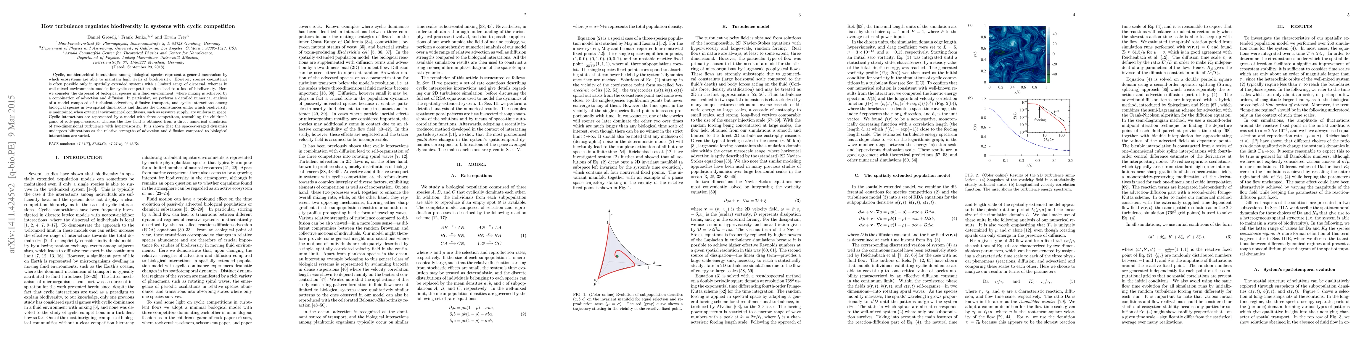 Cyclic, nonhierarchical interactions among biological species represent a general mechanism by which ecosystems are able to maintain high levels of biodiversity. However, species coexistence is often possible only in spatially extended systems with a limited range of dispersal, whereas in well-mixed environments models for cyclic competition often lead to a loss of biodiversity. Here we consider the dispersal of biological species in a fluid environment, where mixing is achieved by a combination of advection and diffusion. In particular, we perform a detailed numerical analysis of a model composed of turbulent advection, diffusive transport, and cyclic interactions among biological species in two spatial dimensions and discuss the circumstances under which biodiversity is maintained when external environmental conditions, such as resource supply, are uniform in space. Cyclic interactions are represented by a model with three competitors, resembling the children's game of rock-paper-scissors, whereas the flow field is obtained from a direct numerical simulation of two-dimensional turbulence with hyperviscosity. It is shown that the space-averaged dynamics undergoes bifurcations as the relative strengths of advection and diffusion compared to biological interactions are varied.