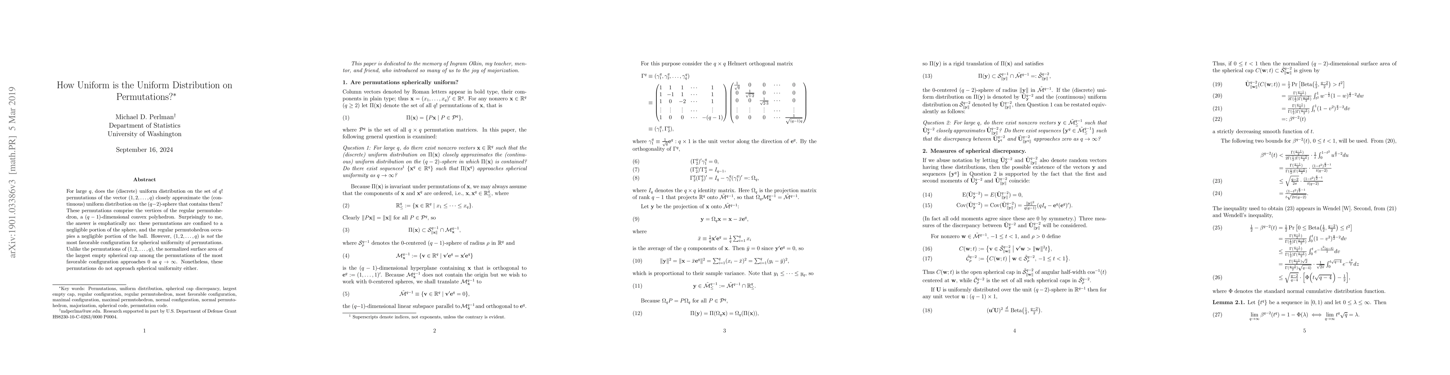 This paper investigates whether the uniform distribution on permutations of $(1,2,\dots,q)$ approximates the continuous uniform distribution on the $(q-2)$-sphere, finding that it does not. It concludes that permutations occupy only a negligible portion of the sphere, and proposes that other configurations may exhibit better spherical uniformity.
