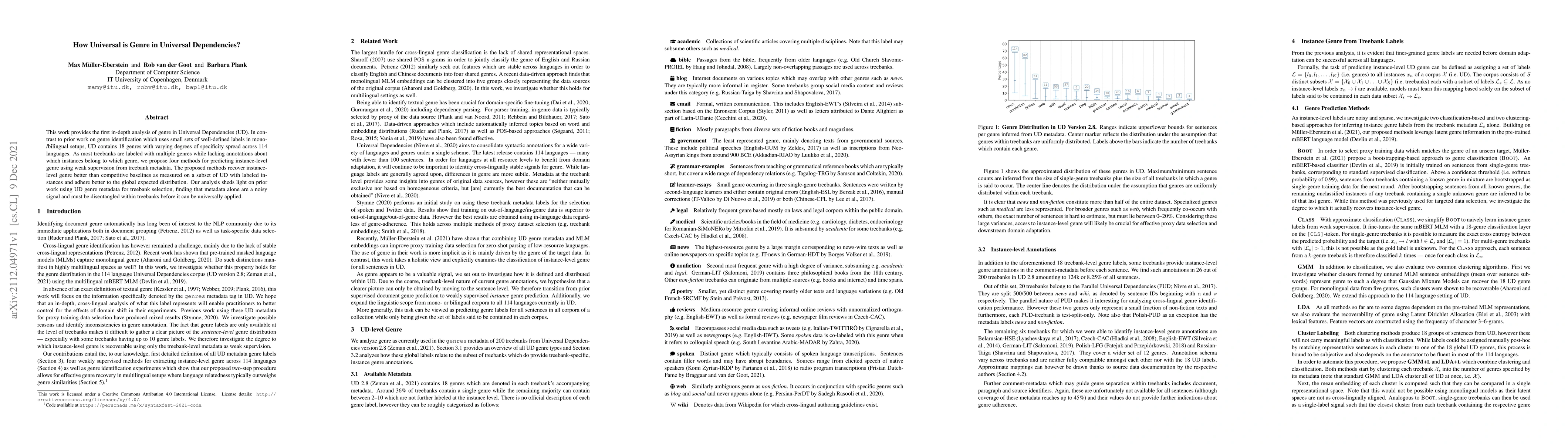 This work provides the first in-depth analysis of genre in Universal Dependencies (UD). In contrast to prior work on genre identification which uses small sets of well-defined labels in mono-/bilingual setups, UD contains 18 genres with varying degrees of specificity spread across 114 languages. As most treebanks are labeled with multiple genres while lacking annotations about which instances belong to which genre, we propose four methods for predicting instance-level genre using weak supervision from treebank metadata. The proposed methods recover instance-level genre better than competitive baselines as measured on a subset of UD with labeled instances and adhere better to the global expected distribution. Our analysis sheds light on prior work using UD genre metadata for treebank selection, finding that metadata alone are a noisy signal and must be disentangled within treebanks before it can be universally applied.