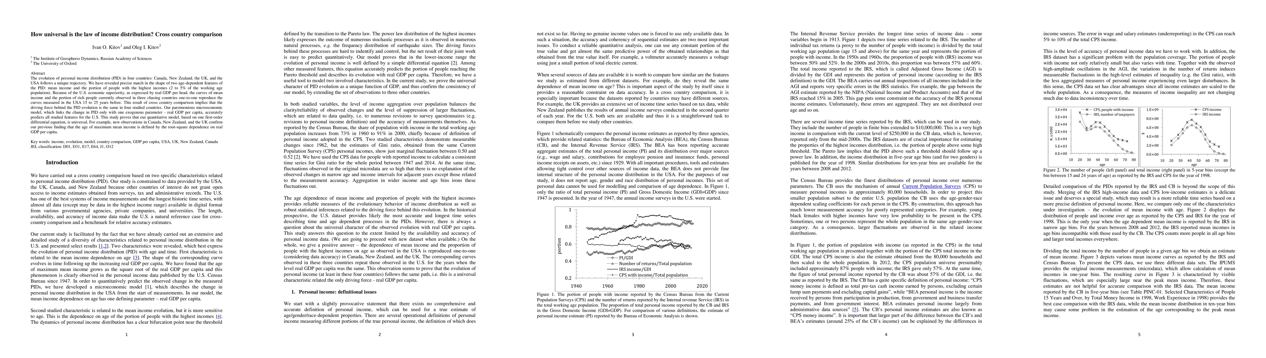 The evolution of personal income distribution (PID) in four countries: Canada, New Zealand, the UK, and the USA follows a unique trajectory. We have revealed precise match in the shape of two age-dependent features of the PID: mean income and the portion of people with the highest incomes (2 to 5% of the working age population). Because of the U.S. economic superiority, as expressed by real GDP per head, the curves of mean income and the portion of rich people currently observed in three chasing countries one-to-one reproduce the curves measured in the USA 15 to 25 years before. This result of cross country comparison implies that the driving force behind the PID evolution is the same in four studied countries. Our parsimonious microeconomic model, which links the change in PID only with one exogenous parameter - real GDP per capita, accurately predicts all studied features for the U.S. This study proves that our quantitative model, based on one first-order differential equation, is universal. For example, new observations in Canada, New Zealand, and the UK confirm our previous finding that the age of maximum mean income is defined by the root-square dependence on real GDP per capita.