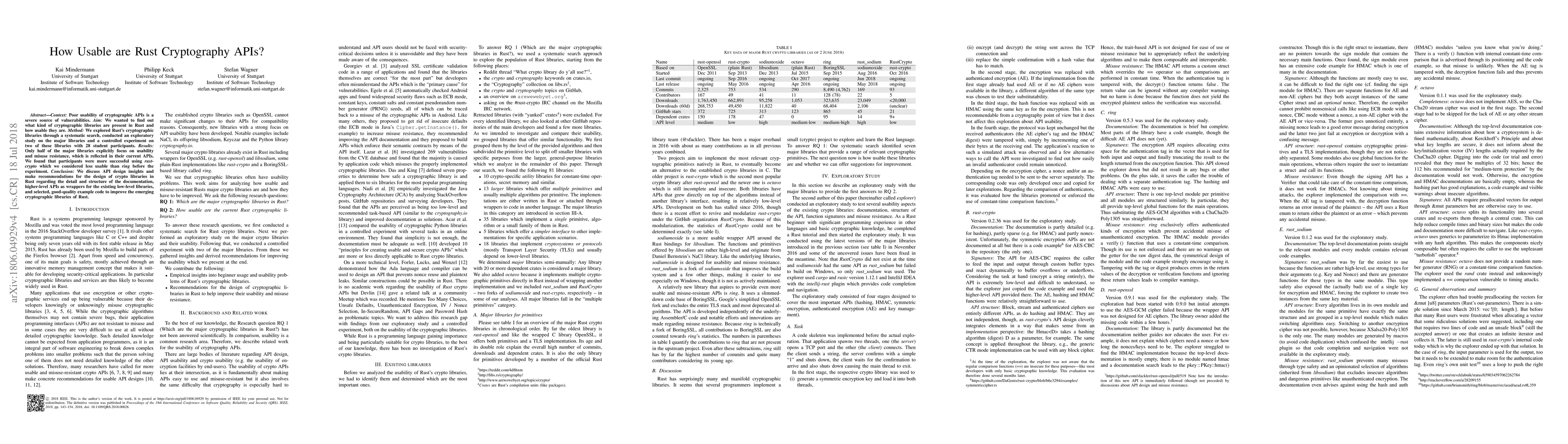 Context: Poor usability of cryptographic APIs is a severe source of vulnerabilities. Aim: We wanted to find out what kind of cryptographic libraries are present in Rust and how usable they are. Method: We explored Rust's cryptographic libraries through a systematic search, conducted an exploratory study on the major libraries and a controlled experiment on two of these libraries with 28 student participants. Results: Only half of the major libraries explicitly focus on usability and misuse resistance, which is reflected in their current APIs. We found that participants were more successful using rust-crypto which we considered less usable than ring before the experiment. Conclusion: We discuss API design insights and make recommendations for the design of crypto libraries in Rust regarding the detail and structure of the documentation, higher-level APIs as wrappers for the existing low-level libraries, and selected, good-quality example code to improve the emerging cryptographic libraries of Rust.