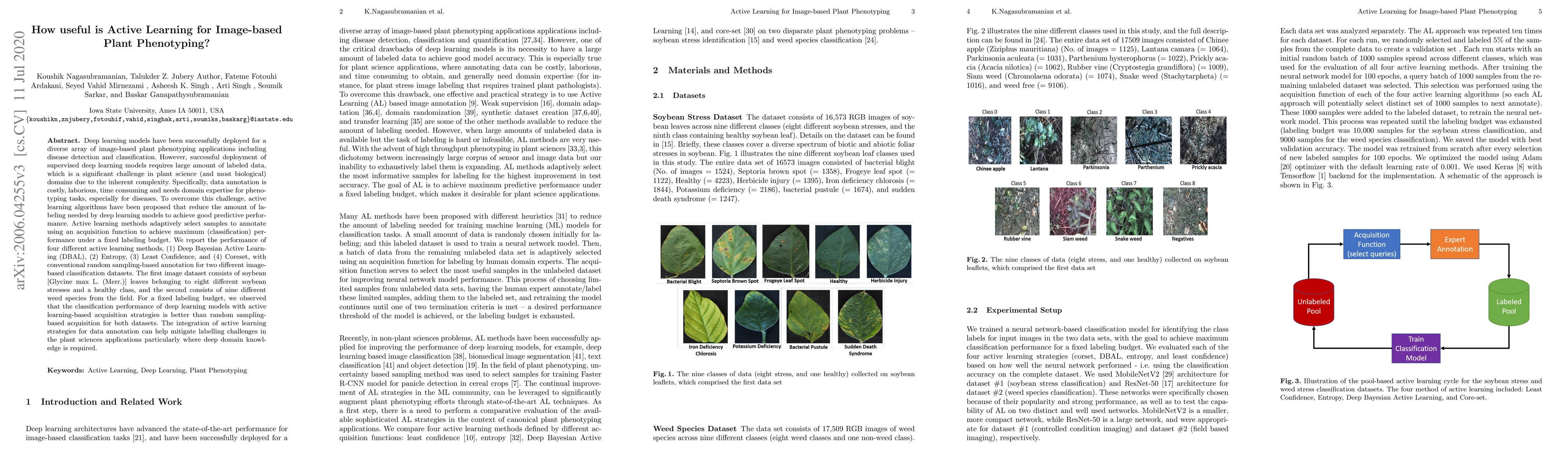 Deep learning models have been successfully deployed for a diverse array of image-based plant phenotyping applications including disease detection and classification. However, successful deployment of supervised deep learning models requires large amount of labeled data, which is a significant challenge in plant science (and most biological) domains due to the inherent complexity. Specifically, data annotation is costly, laborious, time consuming and needs domain expertise for phenotyping tasks, especially for diseases. To overcome this challenge, active learning algorithms have been proposed that reduce the amount of labeling needed by deep learning models to achieve good predictive performance. Active learning methods adaptively select samples to annotate using an acquisition function to achieve maximum (classification) performance under a fixed labeling budget. We report the performance of four different active learning methods, (1) Deep Bayesian Active Learning (DBAL), (2) Entropy, (3) Least Confidence, and (4) Coreset, with conventional random sampling-based annotation for two different image-based classification datasets. The first image dataset consists of soybean [Glycine max L. (Merr.)] leaves belonging to eight different soybean stresses and a healthy class, and the second consists of nine different weed species from the field. For a fixed labeling budget, we observed that the classification performance of deep learning models with active learning-based acquisition strategies is better than random sampling-based acquisition for both datasets. The integration of active learning strategies for data annotation can help mitigate labelling challenges in the plant sciences applications particularly where deep domain knowledge is required.