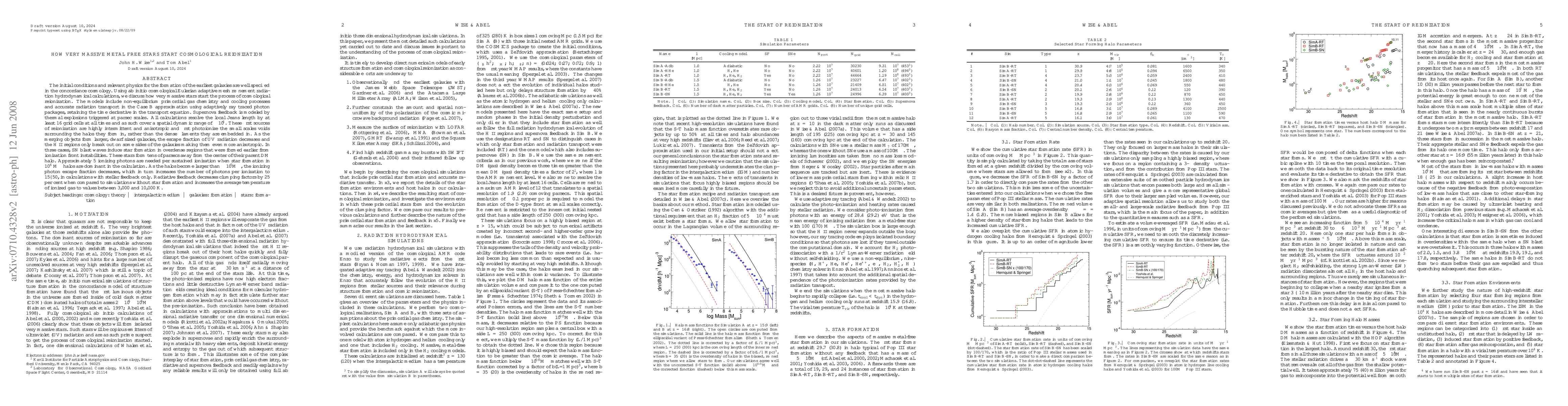 (Abridged) Using ab initio cosmological Eulerian adaptive mesh refinement radiation hydrodynamical calculations, we discuss how very massive stars start the process of cosmological reionization. The models include non-equilibrium primordial gas chemistry and cooling processes and accurate radiation transport in the Case B approximation using adaptively ray traced photon packages, retaining the time derivative in the transport equation. Supernova feedback is modeled by thermal explosions triggered at parsec scales. All calculations resolve the local Jeans length by at least 16 grid cells at all times and as such cover a spatial dynamic range of ~10^6. These first sources of reionization are highly intermittent and anisotropic and first photoionize the small scales voids surrounding the halos they form in, rather than the dense filaments they are embedded in. As the merging objects form larger, dwarf sized galaxies, the escape fraction of UV radiation decreases and the HII regions only break out on some sides of the galaxies making them even more anisotropic. In three cases, SN blast waves induce star formation in overdense regions that were formed earlier from ionization front instabilities. These stars form tens of parsecs away from the center of their parent DM halo. Approximately 5 ionizing photons are needed per sustained ionization when star formation in 10^6 M_sun halos are dominant in the calculation. As the halos become larger than ~10^7 M_sun, the ionizing photon escape fraction decreases, which in turn increases the number of photons per ionization to 15-50, in calculations with stellar feedback only. Supernova feedback in these more massive halos creates a more diffuse medium, allowing the stellar radiation to escape more easily and maintaining the ratio of 5 ionizing photons per sustained ionization.