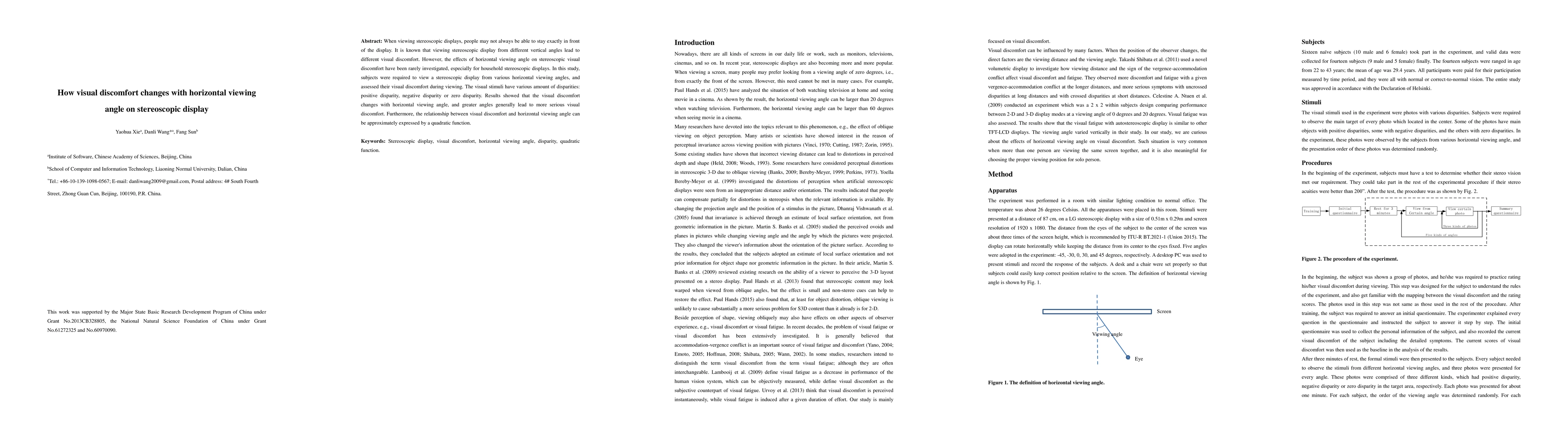 Viewing discomfort on stereoscopic displays varies with horizontal viewing angle, with greater angles causing more discomfort, which can be described by a quadratic function.