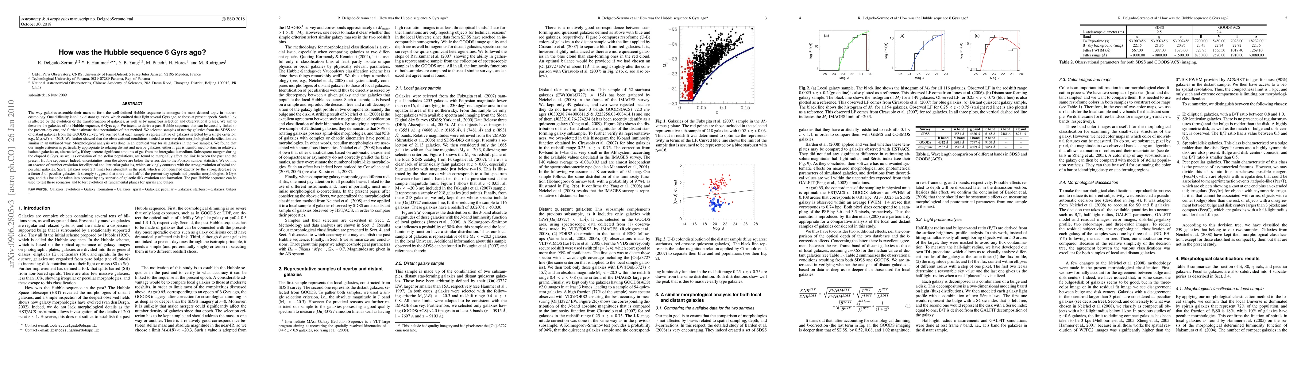 The study investigates the Hubble sequence of galaxies 6 billion years ago, finding no significant evolution in elliptical and lenticular galaxies, while spiral galaxies were 2.3 times less common, compensated by a fivefold decrease in peculiar galaxies, suggesting that many present-day spirals had peculiar morphologies in the past. This past sequence can inform models of galactic evolution and the fundamental planes.