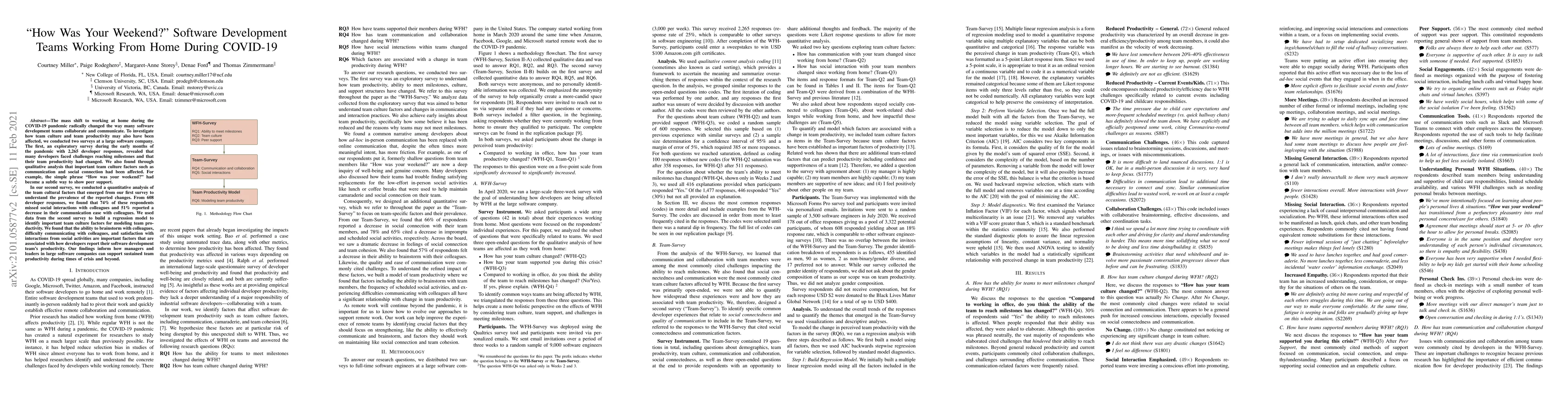 This study explores how the shift to remote work during COVID-19 affected software development teams' culture and productivity. Surveys revealed that while many developers faced challenges in reaching milestones, team culture factors like communication and social connection significantly changed, with "How was your weekend?" symbolizing peer support. Follow-up analysis showed that 74% missed social interactions, and 51% felt less communication ease, highlighting key factors like brainstorming ability and satisfaction with social interactions as crucial for team productivity.