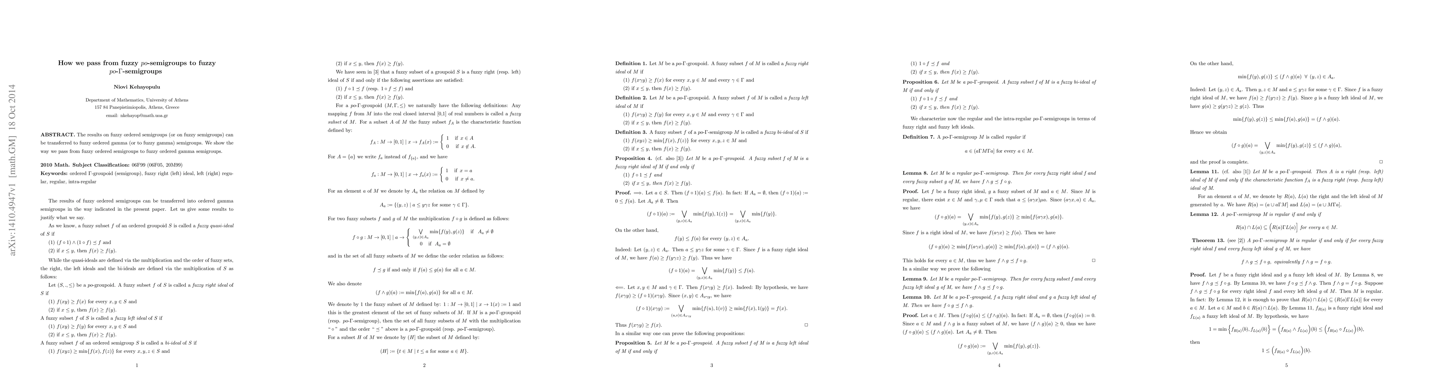 The results on fuzzy ordered semigroups (or on fuzzy semigroups) can be transferred to fuzzy ordered gamma (or to fuzzy gamma) semigroups. We show the way we pass from fuzzy ordered semigroups to fuzzy ordered gamma semigroups.