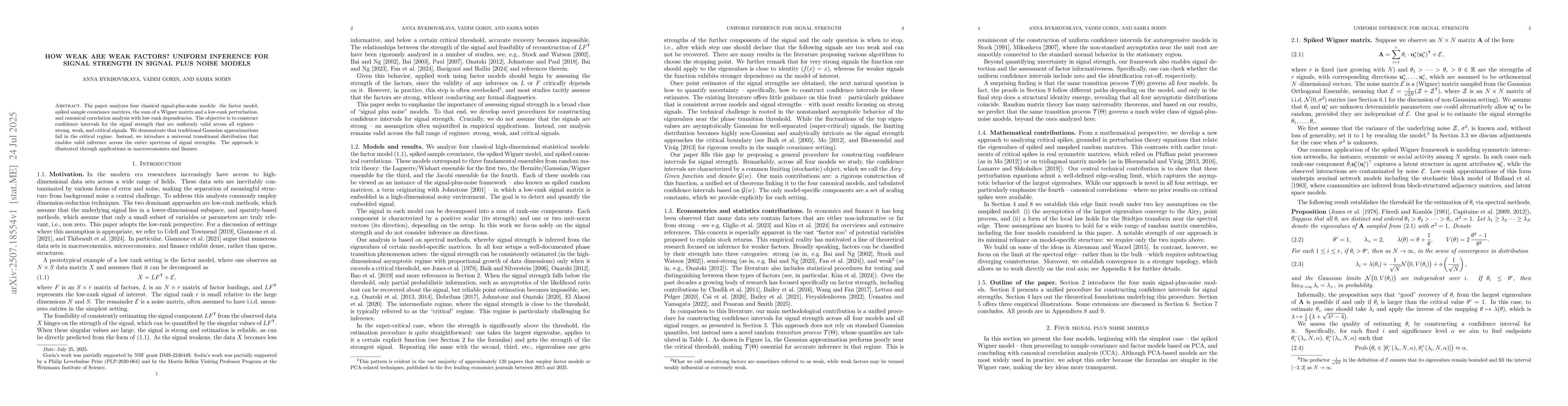 The paper analyzes four classical signal-plus-noise models: the factor model, spiked sample covariance matrices, the sum of a Wigner matrix and a low-rank perturbation, and canonical correlation analysis with low-rank dependencies. The objective is to construct confidence intervals for the signal strength that are uniformly valid across all regimes - strong, weak, and critical signals. We demonstrate that traditional Gaussian approximations fail in the critical regime. Instead, we introduce a universal transitional distribution that enables valid inference across the entire spectrum of signal strengths. The approach is illustrated through applications in macroeconomics and finance.