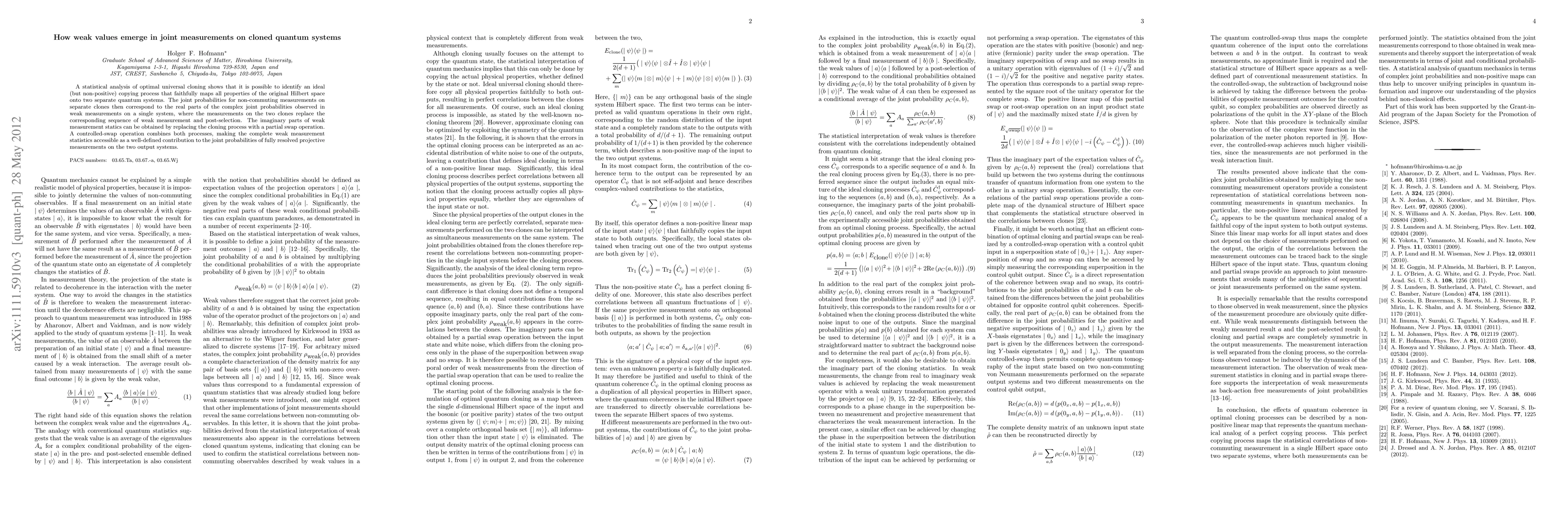 This paper explores how weak measurement values arise in joint measurements on cloned quantum systems, revealing that the joint probabilities of non-commuting measurements on cloned systems correspond to the real parts of weak measurement statistics. The imaginary parts are obtained via a partial swap operation, with a controlled-swap operation enabling full access to complete weak measurement statistics.