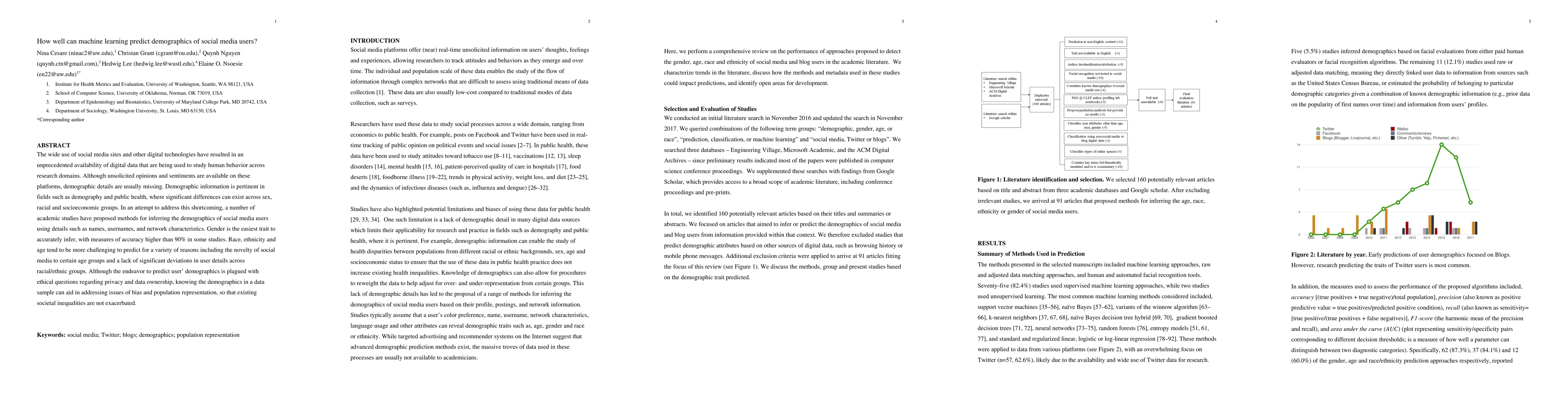 The wide use of social media sites and other digital technologies have resulted in an unprecedented availability of digital data that are being used to study human behavior across research domains. Although unsolicited opinions and sentiments are available on these platforms, demographic details are usually missing. Demographic information is pertinent in fields such as demography and public health, where significant differences can exist across sex, racial and socioeconomic groups. In an attempt to address this shortcoming, a number of academic studies have proposed methods for inferring the demographics of social media users using details such as names, usernames, and network characteristics. Gender is the easiest trait to accurately infer, with measures of accuracy higher than 90 percent in some studies. Race, ethnicity and age tend to be more challenging to predict for a variety of reasons including the novelty of social media to certain age groups and a lack of significant deviations in user details across racial and ethnic groups. Although the endeavor to predict user demographics is plagued with ethical questions regarding privacy and data ownership, knowing the demographics in a data sample can aid in addressing issues of bias and population representation, so that existing societal inequalities are not exacerbated.