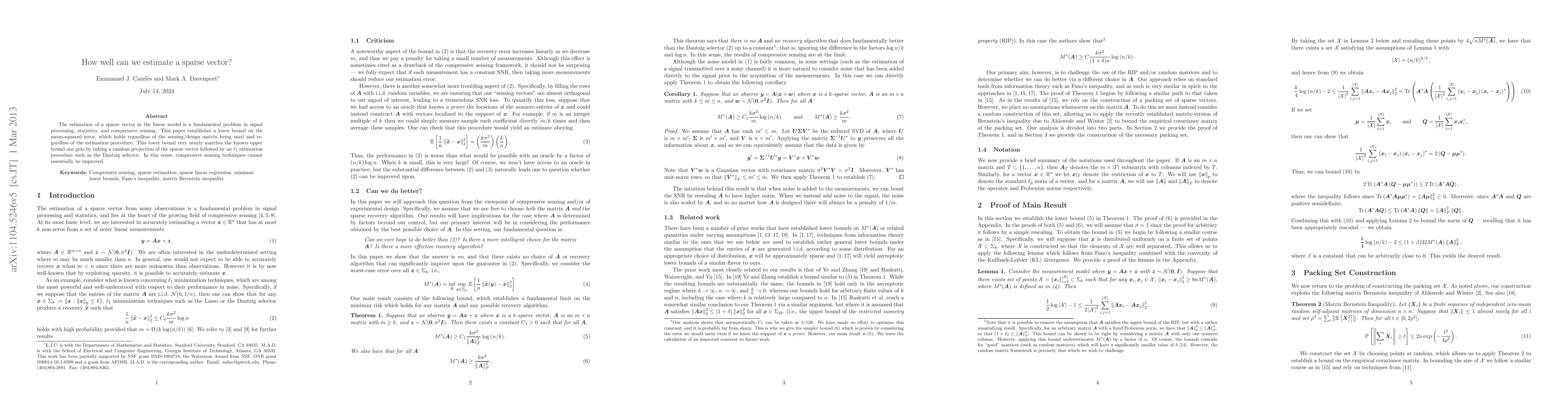 The estimation of a sparse vector in the linear model is a fundamental problem in signal processing, statistics, and compressive sensing. This paper establishes a lower bound on the mean-squared error, which holds regardless of the sensing/design matrix being used and regardless of the estimation procedure. This lower bound very nearly matches the known upper bound one gets by taking a random projection of the sparse vector followed by an $\ell_1$ estimation procedure such as the Dantzig selector. In this sense, compressive sensing techniques cannot essentially be improved.