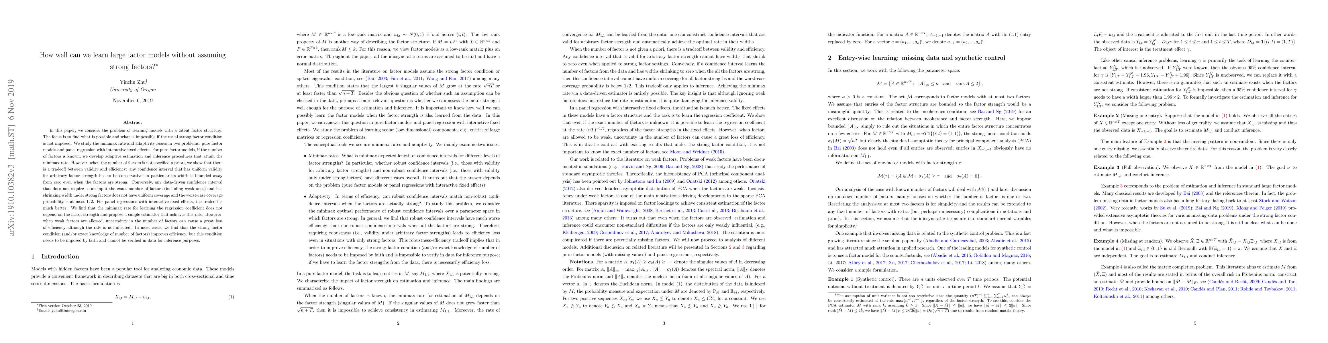 This paper explores learning large factor models without assuming strong factors, finding that certain tradeoffs exist between validity and efficiency in estimation and inference procedures.