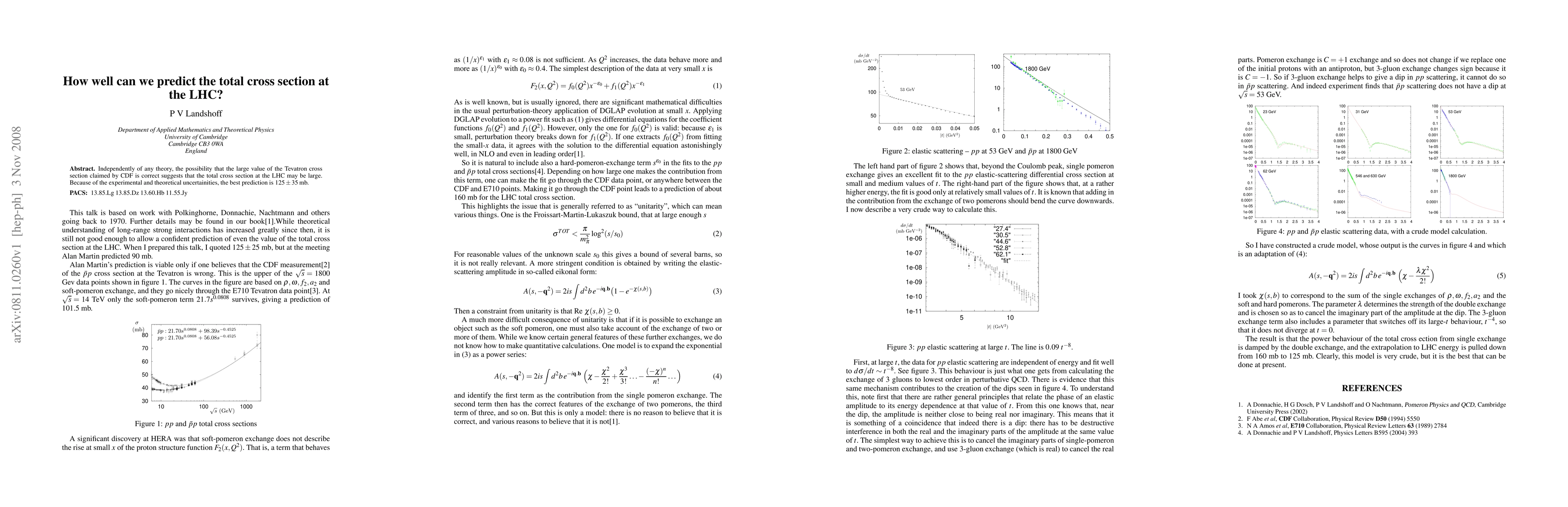 Summary: The paper discusses the prediction of the total cross section at the LHC, suggesting it may be large if the Tevatron cross section claims by CDF are correct. The best prediction, considering experimental and theoretical uncertainties, is $125\pm 35$ mb.