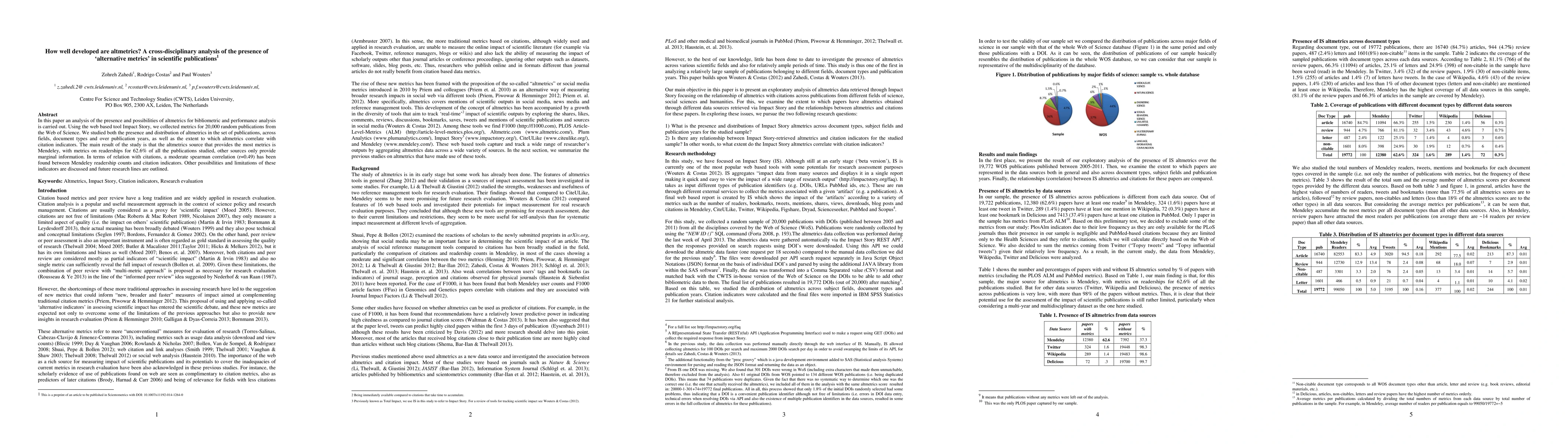 This study examines the prevalence and distribution of altmetrics across various scientific publications, finding that Mendeley provides the most significant readership metrics. A moderate correlation (r=0.49) was found between Mendeley readership and traditional citation metrics, indicating potential for altmetrics in bibliometric analysis.