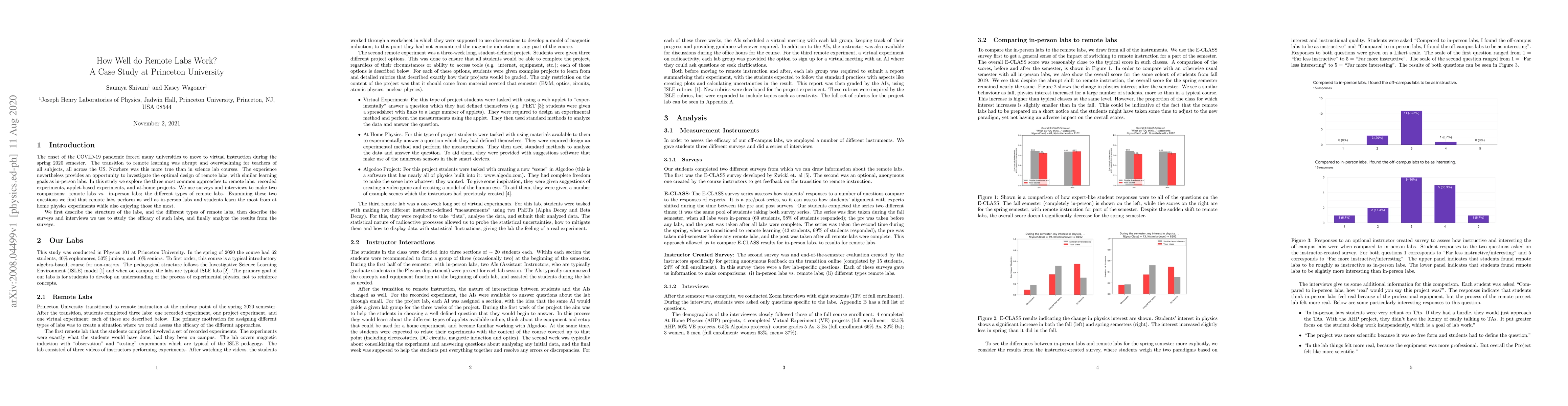 The onset of the COVID-19 pandemic forced many universities to move to virtual instruction during the spring 2020 semester. The transition to remote learning was abrupt and overwhelming for teachers of all subjects, all across the US. Nowhere was this more true than in science lab courses. The experience nevertheless provides an opportunity to investigate the optimal design of remote labs, with similar learning goals as in-person labs. In this study we explore the three most common approaches to remote labs: recorded experiments, applet-based experiments, and at-home projects. We use surveys and interviews to make two comparisons: remote labs vs. in-person labs; the different types of remote labs. Examining these two questions we find that remote labs perform as well as in-person labs and students learn the most from at home physics experiments while also enjoying those the most.