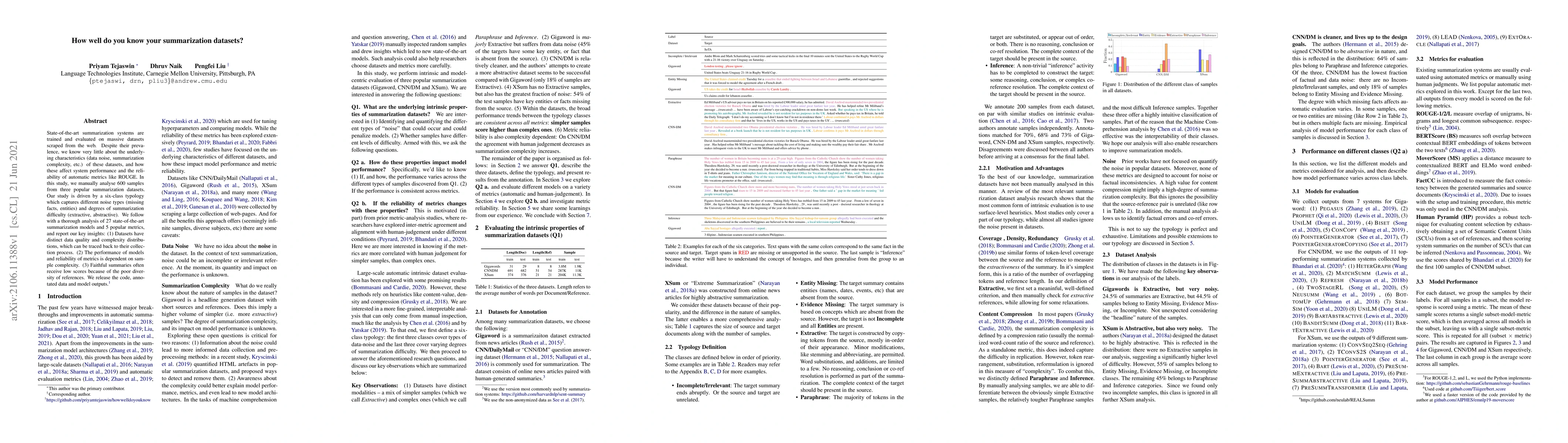 State-of-the-art summarization systems are trained and evaluated on massive datasets scraped from the web. Despite their prevalence, we know very little about the underlying characteristics (data noise, summarization complexity, etc.) of these datasets, and how these affect system performance and the reliability of automatic metrics like ROUGE. In this study, we manually analyze 600 samples from three popular summarization datasets. Our study is driven by a six-class typology which captures different noise types (missing facts, entities) and degrees of summarization difficulty (extractive, abstractive). We follow with a thorough analysis of 27 state-of-the-art summarization models and 5 popular metrics, and report our key insights: (1) Datasets have distinct data quality and complexity distributions, which can be traced back to their collection process. (2) The performance of models and reliability of metrics is dependent on sample complexity. (3) Faithful summaries often receive low scores because of the poor diversity of references. We release the code, annotated data and model outputs.