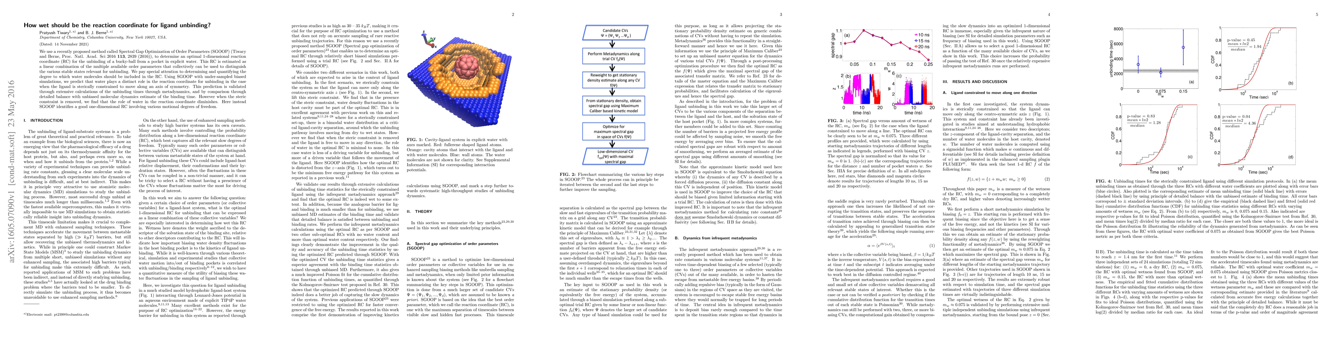 This study utilizes the Spectral Gap Optimization of Order Parameters (SGOOP) method to determine an optimal reaction coordinate for the unbinding of a bucky-ball from a pocket in explicit water, finding that water inclusion in the coordinate is crucial when the ligand is constrained but diminishes when this constraint is removed. The findings are validated through metadynamics and comparison with unbiased molecular dynamics.
