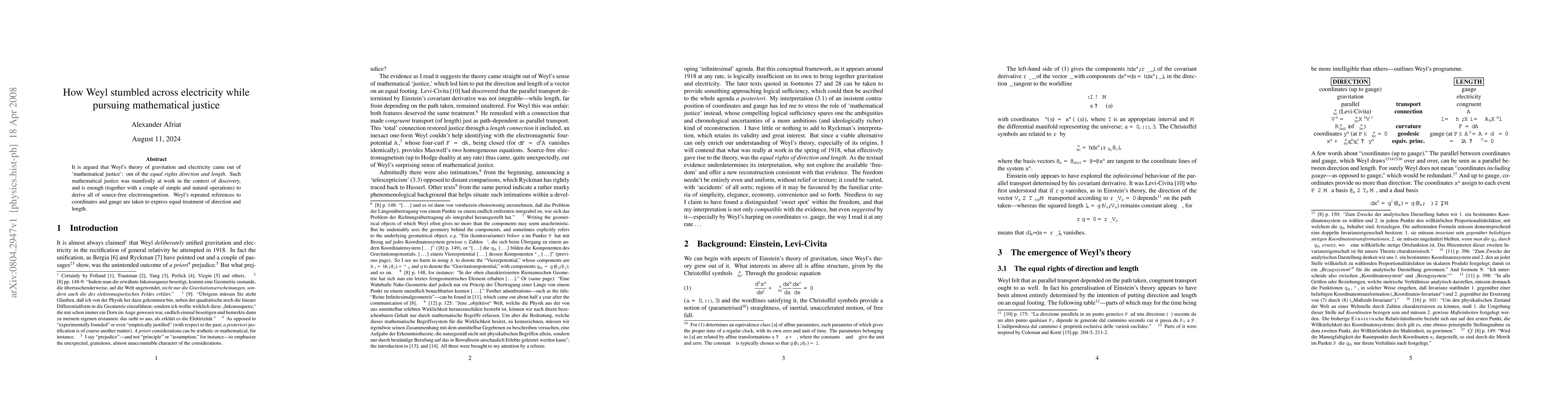 It is argued that Weyl's theory of gravitation and electricity came out of `mathematical justice': out of the equal rights direction and length. Such mathematical justice was manifestly at work in the context of discovery, and is enough (together with a couple of simple and natural operations) to derive all of source-free electromagnetism. Weyl's repeated references to coordinates and gauge are taken to express equal treatment of direction and length.