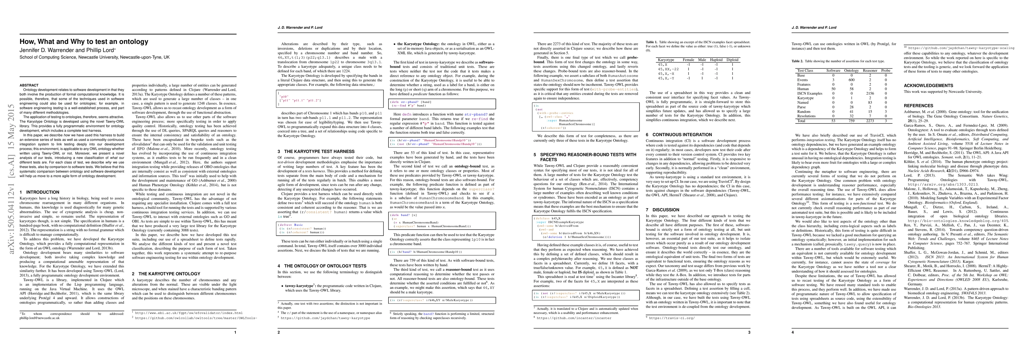 Ontology development relates to software development in that they both involve the production of formal computational knowledge. It is possible, therefore, that some of the techniques used in software engineering could also be used for ontologies; for example, in software engineering testing is a well-established process, and part of many different methodologies. The application of testing to ontologies, therefore, seems attractive. The Karyotype Ontology is developed using the novel Tawny-OWL library. This provides a fully programmatic environment for ontology development, which includes a complete test harness. In this paper, we describe how we have used this harness to build an extensive series of tests as well as used a commodity continuous integration system to link testing deeply into our development process; this environment, is applicable to any OWL ontology whether written using Tawny-OWL or not. Moreover, we present a novel analysis of our tests, introducing a new classification of what our different tests are. For each class of test, we describe why we use these tests, also by comparison to software tests. We believe that this systematic comparison between ontology and software development will help us move to a more agile form of ontology development.