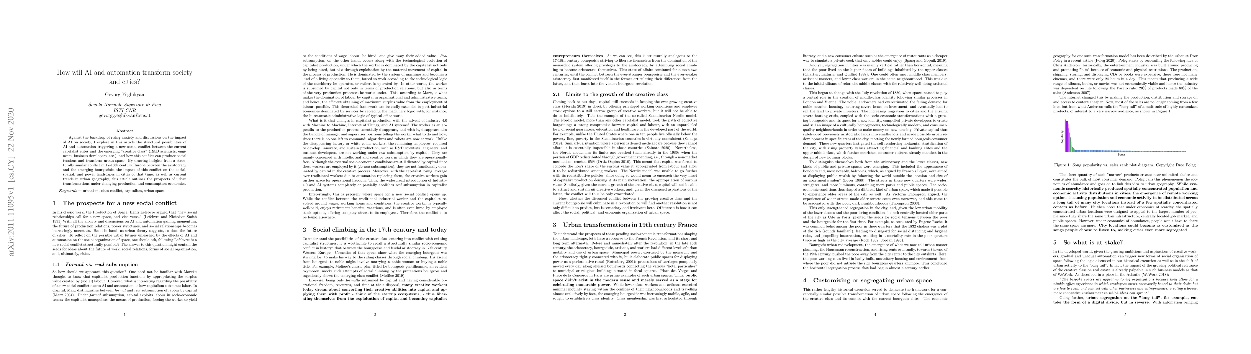 Against the backdrop of rising anxiety and discussions on the impact of AI on society, I explore in this article the structural possibilities of AI and automation triggering a new social conflict between the current capitalist elites and the emerging "creative class" (R&D scientists, engineers, business developers, etc.), and how this conflict can produce social tensions and transform urban space. By drawing insights from a structurally similar conflict in 17-18th century Europe between the aristocracy and the emerging bourgeoisie, the impact of this conflict on the social, spatial, and power landscapes in cities of that time, as well as current trends in urban geography, this article outlines the prospects of urban transformations under changing production and consumption economies.