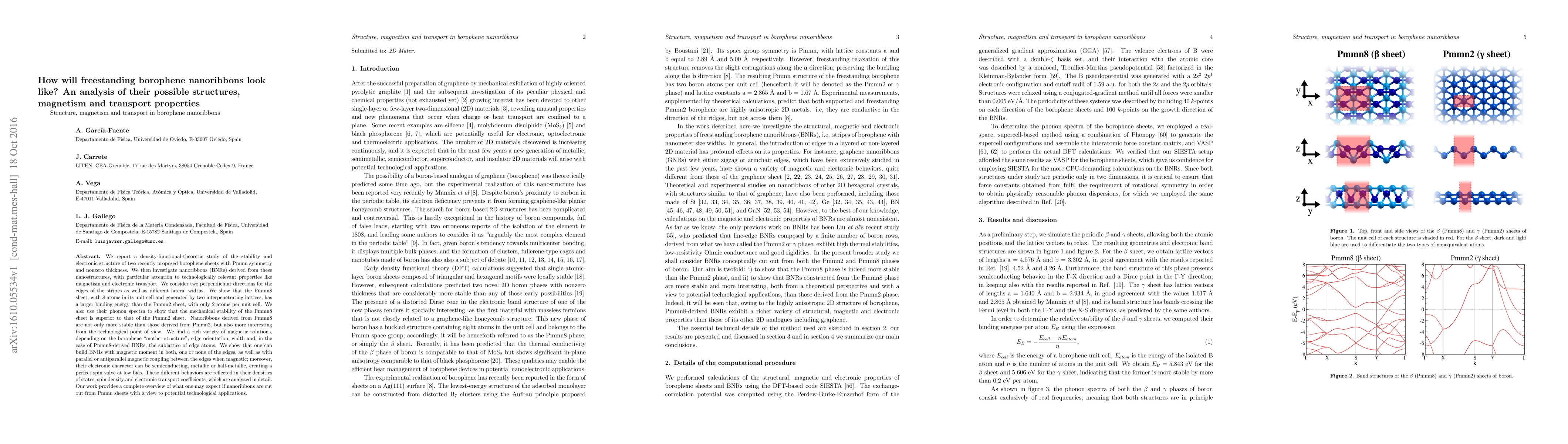 We report a density-functional-theoretic study of the stability and electronic structure of two recently proposed borophene sheets with Pmmn symmetry and nonzero thickness. We then investigate nanoribbons (BNRs) derived from these nanostructures, with particular attention to technologically relevant properties like magnetism and electronic transport. We consider two perpendicular directions for the edges of the stripes as well as different lateral widths. We show that the Pmmn8 sheet, with 8 atoms in its unit cell and generated by two interpenetrating lattices, has a larger binding energy than the Pmmn2 sheet, with only 2 atoms per unit cell. We also use their phonon spectra to show that the mechanical stability of the Pmmn8 sheet is superior to that of the Pmmn2 sheet. Nanoribbons derived from Pmmn8 are not only more stable than those derived from Pmmn2, but also more interesting from the technological point of view. We find a rich variety of magnetic solutions, depending on the borophene "mother structure", edge orientation, width and, in the case of Pmmn8-derived BNRs, the sublattice of edge atoms. We show that one can build BNRs with magnetic moment in both, one or none of the edges, as well as with parallel or antiparallel magnetic coupling between the edges when magnetic; moreover, their electronic character can be semiconducting, metallic or half-metallic, creating a perfect spin valve at low bias. These different behaviors are reflected in their densities of states, spin density and electronic transport coefficients, which are analyzed in detail. Our work provides a complete overview of what one may expect if nanoribbons are cut out from Pmmn sheets with a view to potential technological applications.
