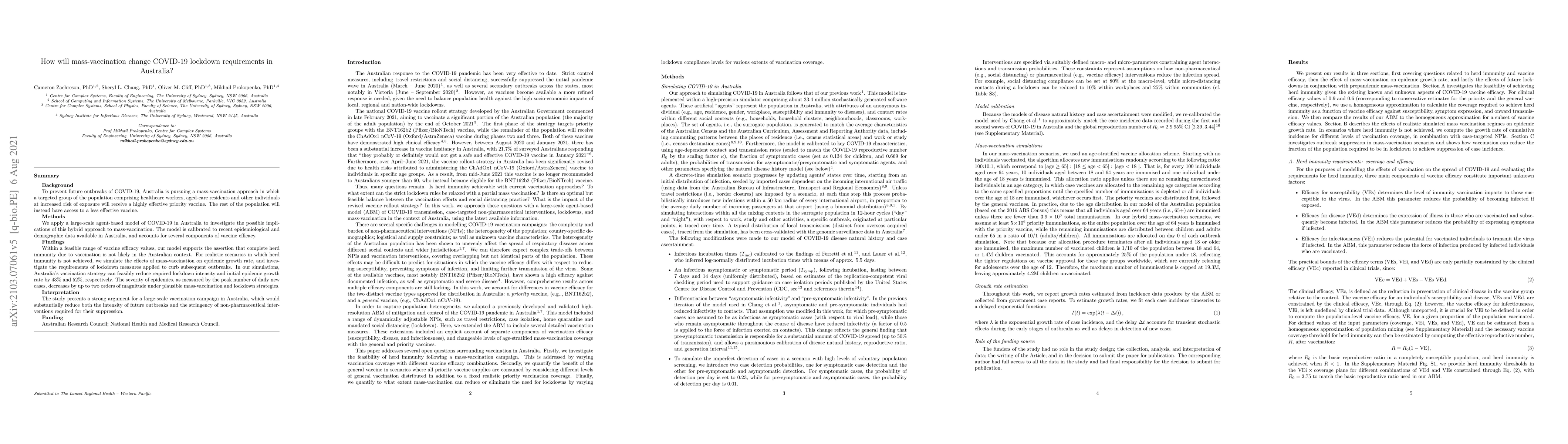 Background: To prevent future outbreaks of COVID-19, Australia is pursuing a mass-vaccination approach in which a targeted group of the population comprising healthcare workers, aged-care residents and other individuals at increased risk of exposure will receive a highly effective priority vaccine. The rest of the population will instead have access to a less effective vaccine. Methods: We apply a large-scale agent-based model of COVID-19 in Australia to investigate the possible implications of this hybrid approach to mass-vaccination. The model is calibrated to recent epidemiological and demographic data available in Australia, and accounts for several components of vaccine efficacy. Findings: Within a feasible range of vaccine efficacy values, our model supports the assertion that complete herd immunity due to vaccination is not likely in the Australian context. For realistic scenarios in which herd immunity is not achieved, we simulate the effects of mass-vaccination on epidemic growth rate, and investigate the requirements of lockdown measures applied to curb subsequent outbreaks. In our simulations, Australia's vaccination strategy can feasibly reduce required lockdown intensity and initial epidemic growth rate by 43% and 52%, respectively. The severity of epidemics, as measured by the peak number of daily new cases, decreases by up to two orders of magnitude under plausible mass-vaccination and lockdown strategies. Interpretation: The study presents a strong argument for a large-scale vaccination campaign in Australia, which would substantially reduce both the intensity of future outbreaks and the stringency of non-pharmaceutical interventions required for their suppression.