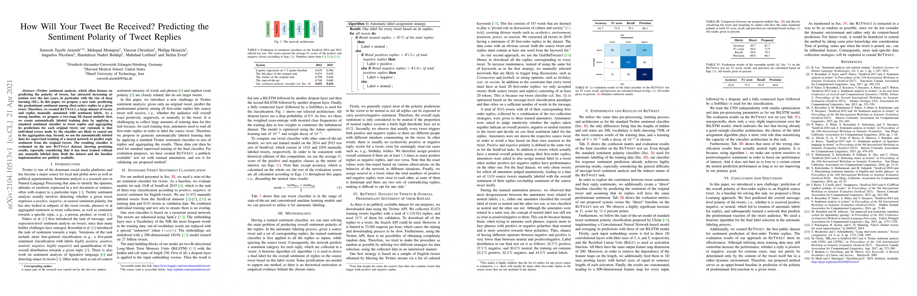 This paper introduces a new task of predicting sentiment polarity among first-order replies to tweets, proposing a two-stage deep learning method with a new dataset named RETWEET. The method shows promising results, particularly as it was trained without manually labeled data.