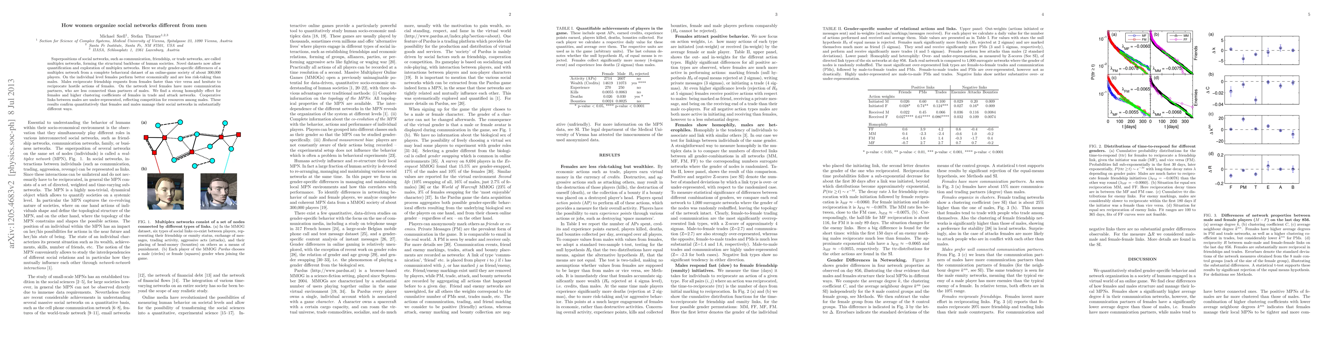 Superpositions of social networks, such as communication, friendship, or trade networks, are called multiplex networks, forming the structural backbone of human societies. Novel datasets now allow quantification and exploration of multiplex networks. Here we study gender-specific differences of a multiplex network from a complete behavioral dataset of an online-game society of about 300,000 players. On the individual level females perform better economically and are less risk-taking than males. Males reciprocate friendship requests from females faster than vice versa and hesitate to reciprocate hostile actions of females. On the network level females have more communication partners, who are less connected than partners of males. We find a strong homophily effect for females and higher clustering coefficients of females in trade and attack networks. Cooperative links between males are under-represented, reflecting competition for resources among males. These results confirm quantitatively that females and males manage their social networks in substantially different ways.