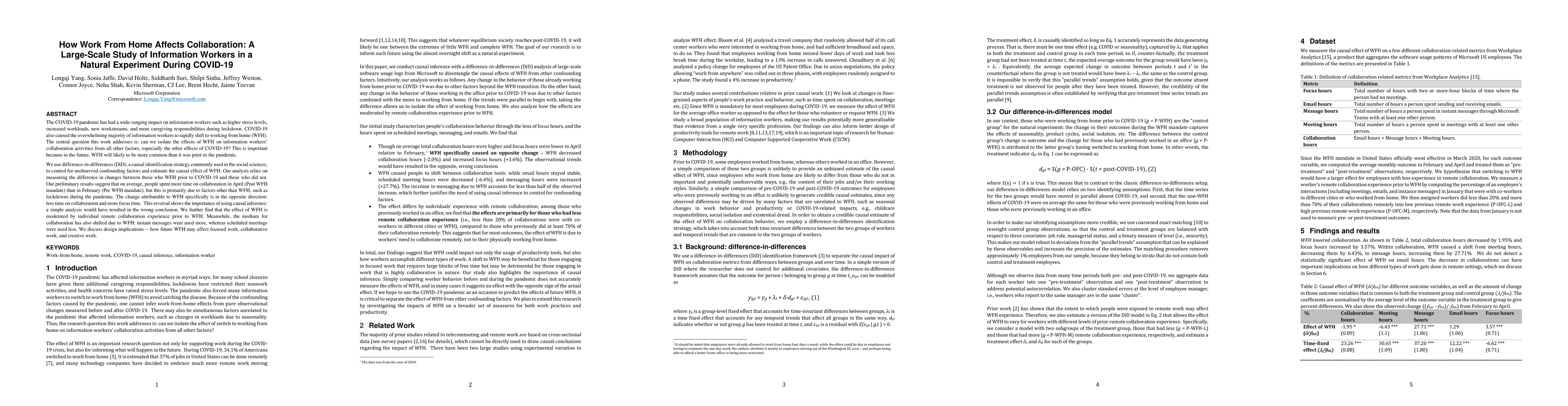 The COVID-19 pandemic has had a wide-ranging impact on information workers such as higher stress levels, increased workloads, new workstreams, and more caregiving responsibilities during lockdown. COVID-19 also caused the overwhelming majority of information workers to rapidly shift to working from home (WFH). The central question this work addresses is: can we isolate the effects of WFH on information workers' collaboration activities from all other factors, especially the other effects of COVID-19? This is important because in the future, WFH will likely to be more common than it was prior to the pandemic. We use difference-in-differences (DiD), a causal identification strategy commonly used in the social sciences, to control for unobserved confounding factors and estimate the causal effect of WFH. Our analysis relies on measuring the difference in changes between those who WFH prior to COVID-19 and those who did not. Our preliminary results suggest that on average, people spent more time on collaboration in April (Post WFH mandate) than in February (Pre WFH mandate), but this is primarily due to factors other than WFH, such as lockdowns during the pandemic. The change attributable to WFH specifically is in the opposite direction: less time on collaboration and more focus time. This reversal shows the importance of using causal inference: a simple analysis would have resulted in the wrong conclusion. We further find that the effect of WFH is moderated by individual remote collaboration experience prior to WFH. Meanwhile, the medium for collaboration has also shifted due to WFH: instant messages were used more, whereas scheduled meetings were used less. We discuss design implications -- how future WFH may affect focused work, collaborative work, and creative work.