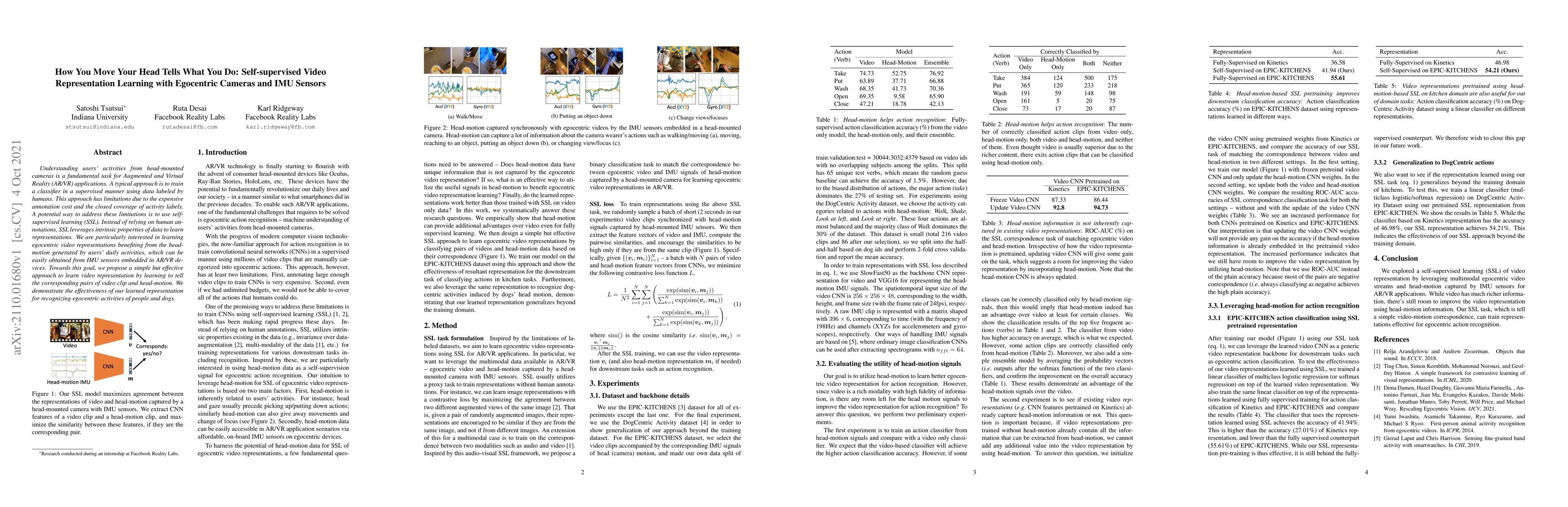 Understanding users' activities from head-mounted cameras is a fundamental task for Augmented and Virtual Reality (AR/VR) applications. A typical approach is to train a classifier in a supervised manner using data labeled by humans. This approach has limitations due to the expensive annotation cost and the closed coverage of activity labels. A potential way to address these limitations is to use self-supervised learning (SSL). Instead of relying on human annotations, SSL leverages intrinsic properties of data to learn representations. We are particularly interested in learning egocentric video representations benefiting from the head-motion generated by users' daily activities, which can be easily obtained from IMU sensors embedded in AR/VR devices. Towards this goal, we propose a simple but effective approach to learn video representation by learning to tell the corresponding pairs of video clip and head-motion. We demonstrate the effectiveness of our learned representation for recognizing egocentric activities of people and dogs.